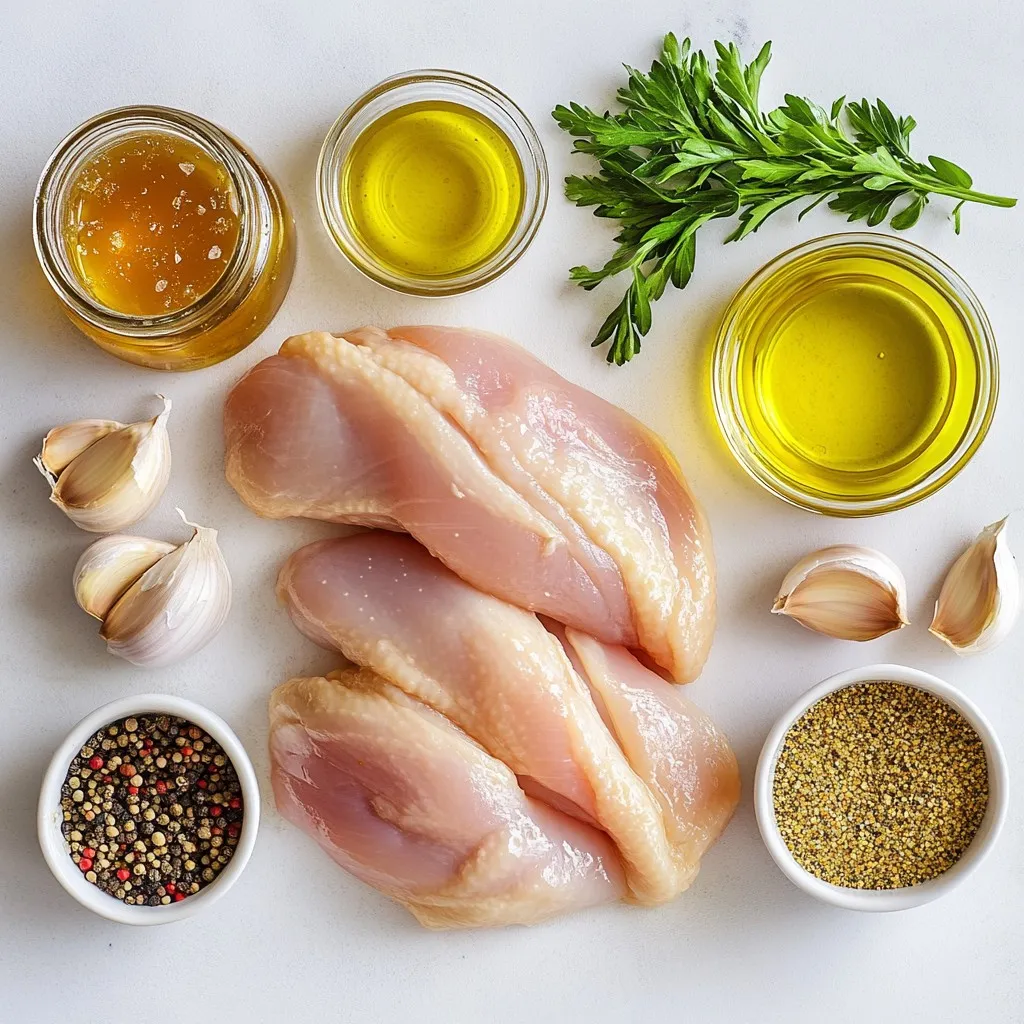 The marinade is key to great honey mustard chicken. Start by mixing honey, Dijon mustard, whole grain mustard, olive oil, minced garlic, and thyme. Whisk these well in a bowl. You want a smooth blend for even flavor. When marinating, use a resealable bag or a shallow dish. This way, the chicken gets coated fully. For best results, let it marinate for at least 30 minutes. If you can, marinate overnight. This deepens the flavor and makes the chicken more tasty.