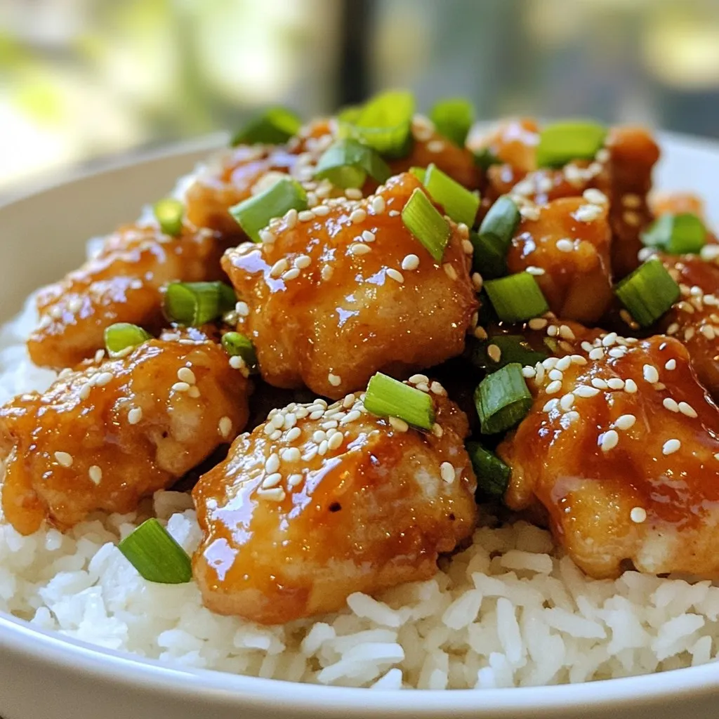 A delicious and sweet chicken dish coated in a honey sesame sauce, perfect for serving over rice.