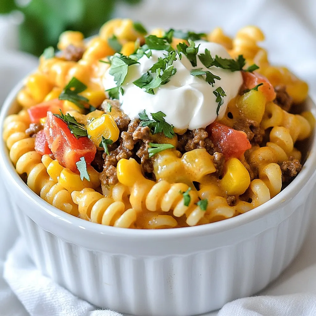 To create this cheesy taco pasta, you will need: - 8 ounces elbow macaroni - 1 lb ground beef or turkey - 1 packet taco seasoning - 1 cup diced tomatoes (canned or fresh) - 1 cup corn (frozen or canned) - 1 bell pepper, diced (any color) - 1 small onion, finely chopped - 2 cups shredded cheddar cheese - 1 cup sour cream - 2 tablespoons olive oil - Salt and pepper to taste - Fresh cilantro for garnish If you don’t have a key ingredient, here are some easy swaps: - Ground beef or turkey: Use ground chicken or plant-based meat for a lighter option. - Elbow macaroni: Swap for any pasta shape you like, such as penne or rotini. - Diced tomatoes: Fresh tomatoes work well, or you can use salsa for more flavor. - Corn: If corn is not available, try black beans or peas instead. - Cheddar cheese: Feel free to use Monterey Jack or pepper jack for a spicy kick. Garnishes add color and flavor. Here are some ideas: - Fresh cilantro adds a nice pop of green. - A dollop of sour cream makes it creamier. - Sliced jalapeños can add heat. - Crushed tortilla chips give a nice crunch. Feel free to mix and match these ingredients to make this dish your own! {{ingredient_image_1}} Start by boiling water in a large pot. Add salt to the water for flavor. Once the water boils, add 8 ounces of elbow macaroni. Cook according to the package instructions until it is al dente. This usually takes about 7-9 minutes. Drain the pasta and set it aside. This step is crucial to get the right texture for your cheesy taco pasta. In the same pot, heat 2 tablespoons of olive oil over medium heat. Add 1 small finely chopped onion and 1 diced bell pepper. Sauté for about 4-5 minutes until the onion and pepper are soft. This will build a strong flavor base for your dish. Stir them often to avoid burning. Next, add 1 pound of ground beef or turkey to the pot. Use a spatula to break up the meat as it cooks. Cook for about 6-8 minutes until the meat is browned. Drain any excess fat if needed. This step adds richness to the dish. It's important to ensure the meat is fully cooked before moving on. To get the best cheese melt, use fresh shredded cheese. Block cheese melts better than pre-shredded ones. Add the cheese in layers while mixing. This helps it melt evenly. Cover the pot for a few minutes after adding cheese. This traps heat and makes the cheese gooey. Want more heat? Add diced jalapeños or hot sauce. For less spice, skip the taco seasoning or choose a mild one. You can also add a bit of sugar to counteract heat. Taste as you go to find the right balance for you. Store leftover cheesy taco pasta in an airtight container. It keeps well in the fridge for about 3-4 days. To reheat, add a splash of water or milk. This will help the pasta stay creamy and not dry out. Heat it on the stove or in the microwave. Stir often to ensure even warming. Pro Tips Use Quality Meat: For a richer flavor, opt for higher quality ground beef or turkey. Grass-fed beef can add a delicious depth to the dish. Customize Your Veggies: Feel free to add more vegetables like zucchini or black olives to enhance nutrition and flavor. Get creative with what you have on hand! Make it Spicy: If you love heat, consider adding diced jalapeños or a sprinkle of cayenne pepper to amp up the spice level. Leftovers Delight: This dish reheats beautifully, making it perfect for meal prep. Just store in an airtight container in the fridge for up to 3 days. {{image_2}} You can make this dish meatless. Start with 8 ounces of elbow macaroni. Use a mix of beans like black beans or pinto beans for protein. Add in 1 cup of cooked lentils for a hearty feel. You can swap the sour cream for plant-based yogurt. Choose dairy-free cheese for a creamy texture. For a gluten-free version, use gluten-free elbow macaroni. This pasta cooks the same way and tastes great. Check taco seasoning to ensure it is gluten-free. You can also use fresh vegetables instead of canned products. This keeps the meal light and tasty. Boost nutrition by adding more veggies. Diced zucchini or mushrooms work well. Spinach or kale can add color and nutrients. Toss in these extras while you sauté the onion and bell pepper. You can also add some frozen peas or carrots when you mix everything together. This makes the dish colorful and even more delicious. You can store leftover cheesy taco pasta in the fridge. Keep it in a sealed container. It stays fresh for about 3 to 4 days. Make sure to let it cool before sealing. This helps keep the texture nice. If you want to save it for later, freezing is a great option. First, let the pasta cool down completely. Then, pack it in an airtight container or freezer bag. It can last up to 2 months in the freezer. When you’re ready to eat, just thaw it in the fridge overnight. To reheat, you can use the microwave or stovetop. For the microwave, place it in a bowl and cover it. Heat it for about 2 to 3 minutes, stirring halfway. On the stovetop, add a splash of water or broth in a pan. Heat on low until warmed through. This keeps it creamy and tasty! Yes, you can use other pasta types. I like penne or rotini for this dish. They hold sauce well. You can also try gluten-free pasta if needed. Just follow the cook time on the package. To add spice, try these ideas: - Use spicy taco seasoning. - Add chopped jalapeños or crushed red pepper. - Mix in a dash of hot sauce. These options can give your dish a nice kick. Adjust to your taste! This dish pairs well with many sides. Try: - A fresh green salad for crunch. - Cornbread for a sweet touch. - Guacamole or salsa for extra flavor. Serve with tortilla chips for a fun crunch! This blog post showed how to make cheesy taco pasta with the right ingredients and steps. We talked about ingredient swaps and tasty garnishes to make it your own. I shared tips for cooking, like how to melt cheese perfectly. You can even try vegetarian, gluten-free, or extra veggie options. Plus, you learned the best ways to store and reheat your leftovers. 