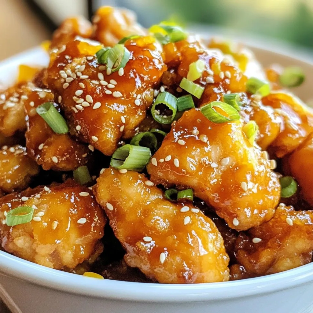 Transfer the orange chicken to a serving plate or bowl. Garnish with sliced green onions and sprinkle sesame seeds on top for an added crunch.