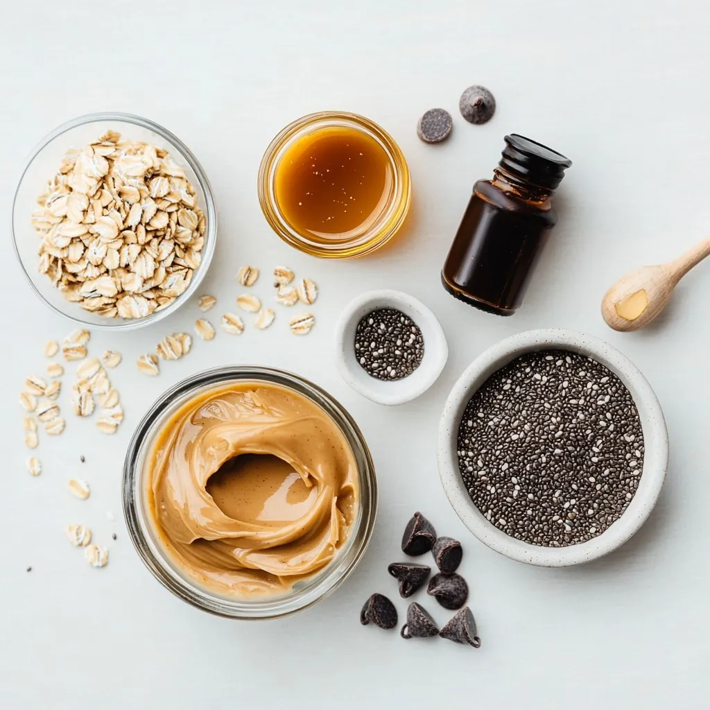 Each ingredient plays a key role. The rolled oats give texture and fiber. Natural peanut butter adds healthy fats and protein. Honey or maple syrup acts as a sweetener and binds everything. Ground flaxseed boosts nutrition with omega-3s. Mini dark chocolate chips add a treat in each bite. Vanilla extract enhances flavor, and sea salt balances sweetness. The optional chia seeds or shredded coconut give extra crunch.