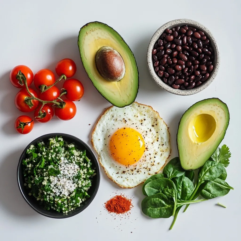 Avocado is creamy and full of good fat. Cherry tomatoes add a sweet burst. Black beans provide extra protein and fiber. Olive oil adds healthy fat and flavor. Seasoning with salt, pepper, and chili powder enhances taste. Fresh cilantro brings a bright finish.