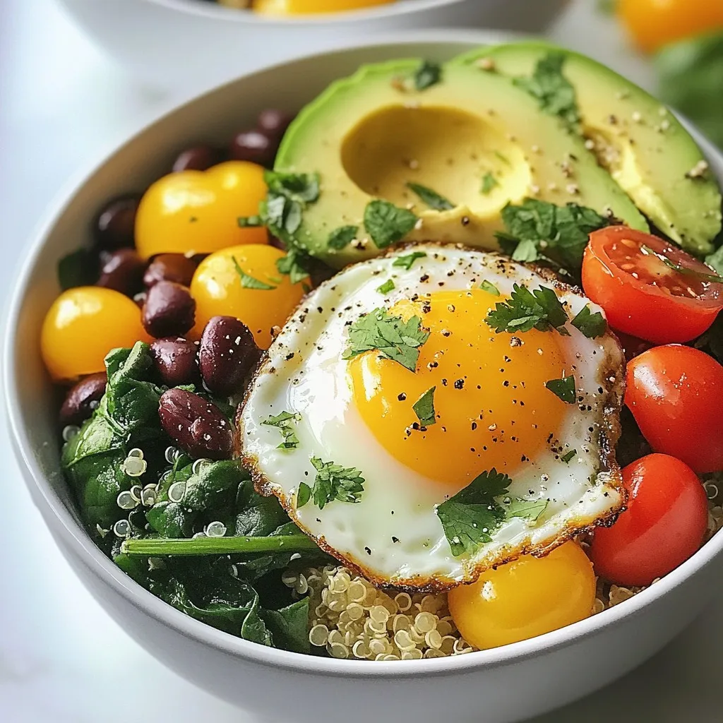 A nutritious and delicious breakfast bowl packed with quinoa, spinach, eggs, and fresh toppings.