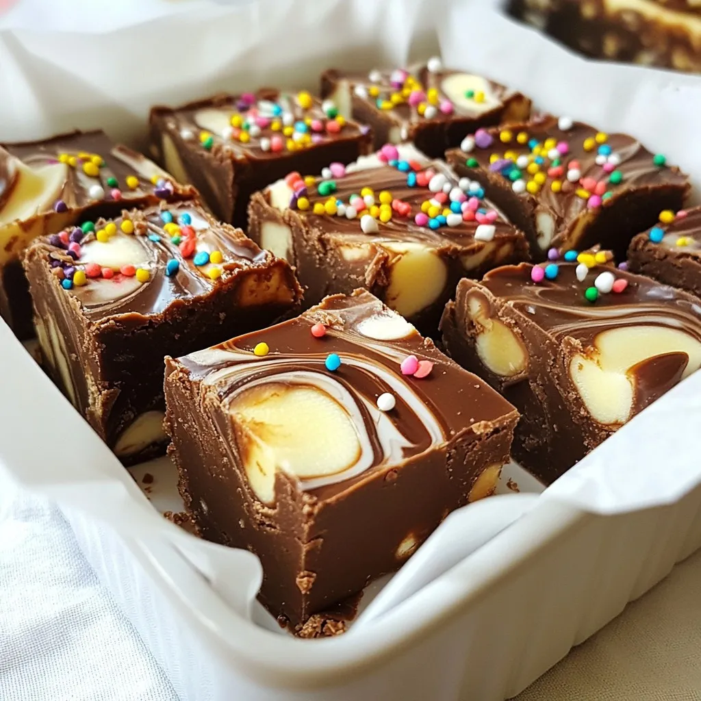 A delightful fudge with a swirl of marshmallows and colorful sprinkles.