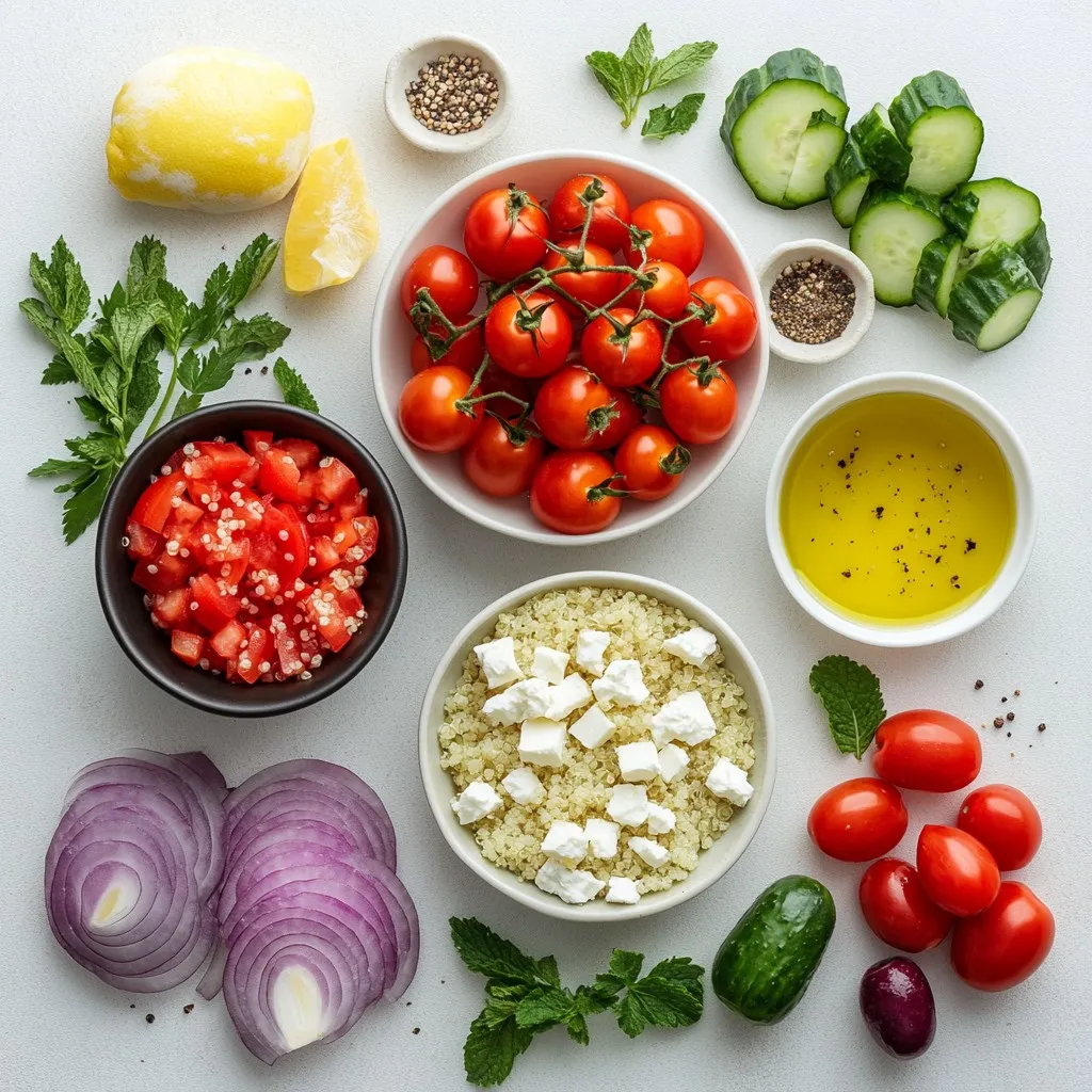 To make a delicious Mediterranean Quinoa Salad, you need fresh and healthy ingredients. Here’s what you'll need: - 1 cup quinoa, rinsed - 2 cups water or vegetable broth - 1 cup cherry tomatoes, halved - 1 cucumber, diced - 1 red bell pepper, diced - 1/4 cup red onion, finely chopped - 1/2 cup Kalamata olives, pitted and sliced - 1/2 cup feta cheese, crumbled (optional) - 1/4 cup fresh parsley, chopped - 1/4 cup fresh mint, chopped - 1/4 cup olive oil - Juice of 1 lemon - 1 teaspoon dried oregano - Salt and pepper to taste Quinoa is the star of this dish. It's packed with protein and fiber. The fresh vegetables add crunch and color. The olives give a briny taste, while feta cheese adds creaminess. Fresh herbs like parsley and mint bring a bright flavor. Finally, the dressing ties everything together with its zesty lemon and olive oil blend. Enjoy the mix of flavors and textures! {{ingredient_image_1}} Boiling the Liquid Start by bringing 2 cups of water or vegetable broth to a boil in a medium pot. This liquid is key for cooking the quinoa. Simmering the Quinoa Once the liquid boils, add 1 cup of rinsed quinoa. Lower the heat to a gentle simmer. Cover the pot and cook for about 15 minutes. The quinoa should absorb all the liquid and become fluffy. Cooling and Fluffing After cooking, take the pot off the heat but keep it covered for 5 more minutes. This helps the quinoa finish cooking. Then, use a fork to fluff the quinoa gently. Let it cool to room temperature. Chopping the Vegetables While the quinoa cools, chop your vegetables. Dice 1 cucumber and 1 red bell pepper. Halve 1 cup of cherry tomatoes and finely chop 1/4 cup of red onion. Mixing the Ingredients In a large bowl, add all the chopped veggies. Toss in 1/2 cup of sliced Kalamata olives, 1/4 cup of fresh parsley, and 1/4 cup of fresh mint. If you like, add 1/2 cup of crumbled feta cheese. Whisking the Dressing In a small bowl, mix 1/4 cup of olive oil, the juice of 1 lemon, 1 teaspoon of dried oregano, and some salt and pepper. Whisk it all together until it blends well. Combining the Salad Pour the dressing over the salad mixture in the large bowl. Add the cooled quinoa and toss gently. Make sure everything is well-coated with the dressing. Taste and adjust the seasoning if needed. Let the salad rest for at least 15 minutes to let the flavors blend. Rinsing Techniques To make quinoa taste its best, always rinse it well. Quinoa has a bitter coating called saponin. Rinse it in cold water using a fine mesh strainer for about 30 seconds. This step washes away the bitter taste. Then, drain it well to avoid excess water in your salad. Cooking Variations You can cook quinoa in water or vegetable broth. Using broth adds more flavor. Use a ratio of 1 cup quinoa to 2 cups liquid. Bring it to a boil, then simmer on low for 15 minutes. Let it sit covered for 5 minutes. This makes it fluffy. Fluff it gently with a fork after it cools. Marinating Time To let the flavors shine, let your salad sit for at least 15 minutes. This time allows the dressing to soak into the vegetables. The longer it sits, the better it tastes. You can even prepare it a few hours in advance. Seasoning Adjustments Tasting is key. Add salt, pepper, or lemon juice to your liking. If you want a stronger flavor, add more dried oregano. Everyone's taste is different, so adjust the seasonings based on what you enjoy. Pro Tips Rinse the Quinoa: Always rinse quinoa before cooking to remove its natural coating, called saponin, which can impart a bitter flavor. Add Extra Flavor: For an enhanced taste, consider cooking the quinoa in vegetable broth instead of water. Chill for Best Flavor: Allow the salad to chill in the refrigerator for at least an hour before serving; this helps the flavors meld together beautifully. Customize Your Ingredients: Feel free to add or substitute ingredients like chickpeas, artichokes, or different herbs to make the salad your own. {{image_2}} You can easily make this salad vegan. Simply skip the feta cheese. Use a mix of nuts or seeds to add some creaminess. Try adding more fresh veggies like bell peppers, carrots, or radishes. You could even toss in some avocado for healthy fats. This not only keeps the salad fresh but also adds crunch and color. Want to boost the protein? Add chickpeas or grilled chicken to your salad. Chickpeas are a great option because they are rich in protein and fiber. They also soak up the flavors well. If you prefer chicken, grill it with some spices for extra taste. For a plant-based protein, consider adding tofu. You can use firm tofu for a nice texture. Marinate it in soy sauce or lemon juice for flavor. Then, grill or sauté it until golden. This way, you make the salad filling and nutritious! - Store leftovers in an airtight container. - Keep the salad in the fridge for up to four days. - To keep it fresh, avoid adding dressing until ready to eat. - Stir the salad gently before serving to mix the flavors. - To freeze, place the salad in a freezer-safe container. - Leave some space at the top for expansion. - It can last up to three months in the freezer. - To thaw, move it to the fridge overnight. - Serve it cold or at room temperature. - You may need to add a little olive oil or lemon juice after thawing. Mediterranean Quinoa Salad stays fresh for about 3 to 5 days in the fridge. Keep it in an airtight container. After a few days, the veggies may lose some crunch. The flavors will still be good, though. Yes, you can make this salad ahead of time! It tastes even better after sitting for a few hours. This lets the flavors mix well. I often make it a day before serving. Just keep it chilled until you're ready to eat. You can add many ingredients to this salad! Here are some ideas: - Avocado for creaminess - Spinach for extra greens - Chickpeas for more protein - Artichoke hearts for a tangy kick - Sun-dried tomatoes for a touch of sweetness Feel free to get creative based on what you like! Yes, quinoa is gluten-free! I