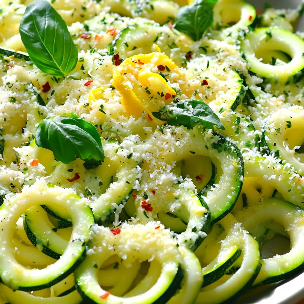 To make Minute Lemon Parmesan Zucchini Noodles, you need fresh, simple ingredients. Here’s what you will need: - 4 medium zucchinis, spiralized into noodles - 2 tablespoons extra virgin olive oil - 2 cloves garlic, finely minced - Zest of 1 large lemon - 3 tablespoons freshly squeezed lemon juice - ½ cup freshly grated Parmesan cheese - ¼ teaspoon red pepper flakes (optional) - Sea salt and freshly cracked black pepper to taste - Fresh basil leaves for garnish These ingredients come together to create a light and zesty dish. The zucchinis serve as the base, making this meal healthy and low-carb. The olive oil adds richness while the garlic brings warmth. The star of this dish is the lemon, giving a bright, fresh flavor. Parmesan cheese adds creaminess and depth. You can adjust the red pepper flakes based on your spice preference. Finally, fresh basil not only looks great but also enhances the dish's aroma. Enjoy crafting this quick meal with these fresh ingredients! Start by spiralizing your zucchinis. If you lack a spiralizer, a vegetable peeler works well too. Create long, noodle-like strands or thin ribbons. Aim for even shapes to cook uniformly. Next, take a large skillet. Heat the extra virgin olive oil over medium heat. Once hot, add the minced garlic. Sauté for 1-2 minutes until fragrant. Stir often to prevent browning. Burnt garlic can ruin the dish. Now, gently add the spiralized zucchini noodles to the skillet. Toss them in the garlic oil. Sauté for about 2-3 minutes. Stir frequently until the noodles are tender but still slightly crunchy. This keeps them al dente. Sprinkle in the lemon zest and juice. If you like a kick, add red pepper flakes. Season with sea salt and cracked black pepper. Stir everything together to coat the noodles evenly. Let the flavors blend beautifully. Remove the skillet from heat. Now, sprinkle freshly grated Parmesan cheese over the noodles. Toss gently to mix. The heat will melt the cheese slightly, adding creaminess to the dish. Plate your zesty zucchini noodles right away. Garnish with fresh basil leaves for color and aroma. For extra cheesiness, add more Parmesan on top. Serve in shallow bowls to highlight the vibrant colors. To get the best texture from zucchini noodles, you want them to stay firm. Cook them just right by sautéing for 2-3 minutes. Toss them often in the hot oil to ensure even cooking. If they get too soft, they can turn mushy. You want a nice bite, so don’t overcook them. Want to spice it up? Try adding more herbs or spices. Basil works great, but you can also use parsley or oregano. For a kick, add more red pepper flakes. A pinch of lemon zest can brighten the dish, too. If you like, toss in some toasted pine nuts for a crunchy twist. Serve your zucchini noodles in shallow bowls. This way, the bright colors pop. Add a lemon slice on the side for a fresh look. You can sprinkle extra Parmesan on top for flair. Use whole basil leaves to decorate each bowl, making it look fancy and inviting. {{image_4}} You can easily add protein to your dish. Try cooked chicken or shrimp for a boost. Simply sauté the protein in the skillet before adding the zucchini noodles. This adds flavor and makes it a full meal. If you want shrimp, cook them until they turn pink. For chicken, use grilled or rotisserie chicken for ease. If you prefer a vegetarian dish, chickpeas or avocado work great. Chickpeas add protein and a nice texture. You can mix them in with the noodles. For avocado, slice it and add it on top for creaminess. This makes your meal hearty and satisfying without meat. This recipe is already low-carb, but you can swap ingredients for gluten-free options. Instead of regular Parmesan, look for gluten-free cheese. You can also add nuts like pine nuts or walnuts for crunch. These additions keep the meal light while ensuring you meet gluten-free needs. To store leftovers, place the zucchini noodles in a clean, airtight container. Make sure to let them cool before sealing. You can keep them in the fridge for 2 to 3 days. This helps keep them fresh and tasty. If you notice any moisture, use a paper towel to absorb it before sealing. When reheating, avoid the microwave if you can. It can make the noodles soggy. Instead, use a skillet over medium heat. Add a splash of olive oil to warm them up. Stir gently for about 2 to 3 minutes. This keeps them firm and tasty. I don’t recommend freezing zucchini noodles. They lose their crunch and become mushy when thawed. If you must freeze them, spiralize and blanch them first. Then, cool them in ice water before freezing. Use a freezer-safe bag and try to remove as much air as possible. They can last up to 3 months in the freezer. You can use a vegetable peeler to make thin ribbons. First, wash the zucchini. Then, hold it steady and peel long strips. This gives you a noodle-like texture. You can also use a box grater. Just run the zucchini down the large holes. It creates small, noodle-like pieces. These methods make great substitutes for spiralized noodles. Yes, you can use frozen zucchini noodles. However, they may lose some texture. Fresh zucchini noodles stay crunchy and have a better bite. If you use frozen ones, thaw them first and drain excess water. This helps keep your dish from getting too watery. For best results, use fresh zucchini for this recipe. To keep zucchini noodles crunchy, avoid overcooking them. Sauté them for just 2-3 minutes. This keeps them tender yet firm. After spiralizing, you can also salt the noodles lightly. Let them sit for a few minutes, then pat dry with paper towels. This draws out extra moisture, helping maintain their crunch. In this blog post, I covered how to make delicious zucchini noodles. First, I explained the key ingredients needed, like fresh zucchinis and lemon juice. Next, I provided step-by-step instructions to cook and flavor them. I shared tips for perfecting the dish and suggested tasty variations. Lastly, I offered storage advice and answered co