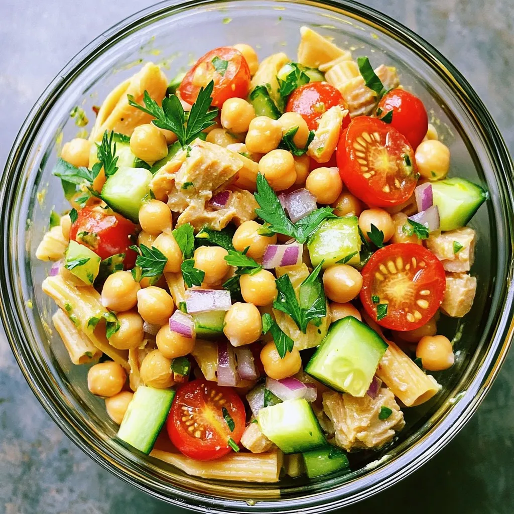 - 2 cups whole wheat pasta - 1 can (5 oz) tuna in water - 1 cup cherry tomatoes Whole wheat pasta gives the salad a healthy base. It adds fiber and keeps you full. Canned tuna is a great protein source. It is easy to use and tasty. Cherry tomatoes add a sweet burst of flavor. They also bring color and freshness to the dish. - 1 cup canned chickpeas - ½ cup diced cucumber - ¼ cup red onion Canned chickpeas add even more protein. They are soft and blend well with other flavors. Diced cucumber brings a nice crunch. It adds a refreshing taste, too. Red onion offers a bit of sharpness. Use it sparingly to avoid overpowering other ingredients. - 3 tablespoons extra virgin olive oil - 2 tablespoons fresh lemon juice - 1 teaspoon garlic powder - Salt and freshly cracked pepper Extra virgin olive oil gives the salad richness. It is a heart-healthy fat that enhances flavor. Fresh lemon juice brightens the dish. It adds a zesty touch that lifts all the flavors. Garlic powder is an easy way to add depth. A pinch of salt and pepper rounds out the taste. These simple ingredients create a dressing that complements the salad perfectly. Start by boiling water. Use a large pot and add 4-5 quarts of salted water. Bring it to a vigorous boil. Once boiling, add 2 cups of whole wheat pasta. Cook the pasta according to the package instructions. This usually takes about 8-10 minutes. You want it al dente, which means it should be firm to the bite. After cooking, drain the pasta in a colander. Rinse it under cold running water until cool. This stops the cooking process. In a large mixing bowl, add the drained tuna, halved cherry tomatoes, rinsed chickpeas, diced cucumber, finely chopped red onion, and fresh parsley. Use a gentle stirring technique to mix everything well. This ensures all flavors combine without breaking up the tuna too much. In a small bowl, combine 3 tablespoons of extra virgin olive oil, 2 tablespoons of fresh lemon juice, and 1 teaspoon of garlic powder. Add a generous pinch of salt and freshly cracked pepper. Whisk the mixture together until it is well blended. This step is key for emulsification, which means the oil and lemon juice will blend nicely. Now, add the cooled pasta to the bowl with the tuna and veggies. Drizzle the prepared dressing over the pasta. Gently toss all the ingredients together. Use a folding motion to coat the pasta and veggies with the dressing evenly. If you want more flavor, cover the bowl with plastic wrap. Chill it in the fridge for about 15-20 minutes. This lets the flavors meld beautifully, making each bite taste even better. - Optimizing boiling time: To cook your pasta just right, use a large pot. Bring 4-5 quarts of salted water to a rolling boil. Add the pasta and cook for 8-10 minutes. Check it often. You want it al dente, firm but not hard. - Rinsing pasta tips: After cooking, drain the pasta and rinse it under cold water. This stops it from cooking more. It also cools the pasta quickly, making it ready for your salad. - Choosing the right dressing balance: A good dressing is key. I use 3 tablespoons of olive oil and 2 tablespoons of lemon juice. This mix adds richness and brightness. Adjust the salt and pepper to your taste. - Importance of chilling the salad: Chilling the salad for 15-20 minutes allows the flavors to blend. It makes every bite tasty. If you have time, do this step! - Serving suggestions: Use clear bowls for your salad. This shows off the bright colors of the cherry tomatoes, cucumber, and parsley. It makes your dish look inviting. - Visual appeal enhancements: Top each serving with extra parsley and a few whole cherry tomatoes. This adds color and makes the dish pop. A beautiful plate makes food even more enjoyable! {{image_4}} You can switch up the protein in your salad. Try different types of fish like salmon or sardines. These options add unique flavors and textures. You can also add beans or legumes like black beans or kidney beans. They boost the protein and add fiber too. This makes your salad even more filling and nutritious. Seasonal veggies can really brighten your pasta salad. Think about adding bell peppers, zucchini, or even spinach. These vegetables add color and crunch. You can mix in roasted veggies for a deeper flavor. For more taste, try using herbs like basil or dill. They can change the whole vibe of your dish. Dressing makes a big difference in flavor. You can choose a creamy dressing or a tangy vinaigrette. For a creamy option, mix in Greek yogurt or avocado. Both add richness and creaminess. If you prefer vinaigrettes, try adding balsamic vinegar or apple cider vinegar. You can also experiment with spices like cumin or paprika. Fresh herbs like cilantro or chives can really enhance the taste. After making your tuna pasta salad, store any leftovers in an airtight container. This keeps the salad fresh and tasty. It’s best to eat it within 3 days. You can enjoy it cold straight from the fridge or let it sit at room temperature for a bit before eating. Can this salad be frozen? I do not recommend freezing this salad. The pasta and vegetables can lose their texture when thawed. If you want to save some for later, try freezing just the pasta. If you choose to do this, separate the pasta from the other ingredients. To refresh the pasta, simply boil it for a minute when you’re ready to use it again. Then mix it with fresh ingredients and dressing. This keeps your meal fresh and full of flavor. This salad stays fresh for about three days in the fridge. After that, the flavors can fade. The veggies might also lose their crunch. For the best taste, enjoy it within this time. Keep it in an airtight container to help it last longer. Yes, you can make this salad ahead of time. Prep it the night before for a quick meal. Just store it in the fridge. For the best flavor, mix the dressing separately. Add it right before you eat. This keeps the pasta and veggies fresh. To make this salad gluten-free, swap the whole wheat pasta 