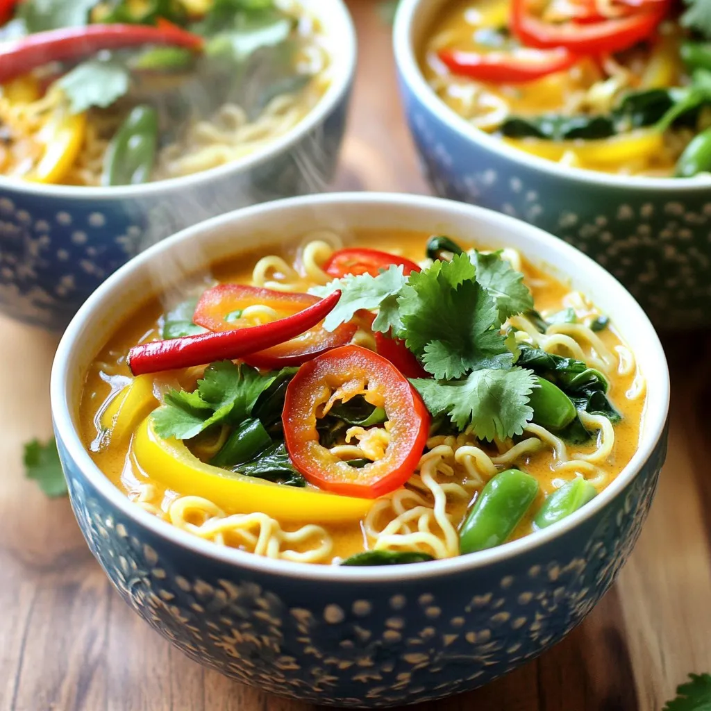 - 2 packs instant ramen noodles (discard seasoning packets) - 1 can (13.5 oz) coconut milk - 1 cup vegetable broth - 2 tablespoons red curry paste - 1 tablespoon soy sauce - 1 cup fresh spinach, packed - 1 bell pepper, sliced (opt for red or yellow for added sweetness) - 1 cup snap peas, trimmed - 1 tablespoon fresh ginger, minced - 2 garlic cloves, minced - Fresh cilantro leaves, for garnish - Sliced chili, for garnish (optional, for added heat) - 1 tablespoon fresh lime juice When I make Minute Thai Coconut Curry Ramen, I gather these key ingredients first. The instant ramen noodles are the base of this dish. They cook quickly and absorb the rich flavors of the broth. Coconut milk adds creaminess. Vegetable broth brings depth, while red curry paste gives that lovely kick. A splash of soy sauce rounds out the taste. Next, I focus on fresh vegetables. Spinach adds color and nutrition. Sliced bell pepper brings sweetness and crunch. Snap peas add a fresh bite, while minced ginger and garlic provide aromatic flavor. Together, these make the dish vibrant and healthy. Finally, I think about garnishes. Fresh cilantro adds a burst of flavor. Sliced chili gives it heat if you like spice. A squeeze of lime juice brightens everything up. These toppings make the ramen look good and taste even better. To start, grab a medium saucepan. In it, combine the coconut milk, vegetable broth, red curry paste, soy sauce, minced ginger, and minced garlic. This mix brings out the rich flavors. Whisk everything together until the red curry paste blends well. Then, heat the broth on medium heat. Keep stirring until it reaches a gentle simmer. This simmering enhances the flavors, making the broth warm and inviting. While the broth heats, put a pot of water on the stove. Bring it to a boil. Once boiling, add the instant ramen noodles. Cook them according to the package instructions, usually about three minutes. After cooking, drain the noodles and set them aside. This step ensures they are ready to join the broth later. Now, it's time to add some color and crunch. Add the sliced bell pepper and snap peas to the simmering broth. Let these veggies cook for about three to four minutes. You want them tender but still bright in color. Next, stir in the fresh spinach. Cook for one more minute until the spinach wilts down nicely. Finally, gently add the cooked ramen noodles into the broth. Drizzle in the fresh lime juice and stir carefully. This step is crucial to mix the flavors without breaking the noodles. Taste the broth and adjust the seasoning if needed. Now, ladle the hot ramen into deep serving bowls. Garnish with fresh cilantro leaves. If you like some heat, add sliced chili on top. Enjoy your bowl of delicious, colorful ramen! You can easily adjust the flavor of your Minute Thai Coconut Curry Ramen. Start with the soy sauce and lime juice. If you like it saltier, add more soy sauce. For extra zest, squeeze in more lime juice. The balance makes a big difference. To enhance the curry flavor, try adding some extra red curry paste. A little goes a long way. You can also add a pinch of sugar. This will help round out the flavors in the broth. Taste as you go to find your perfect mix. Cooking ramen noodles perfectly is key. Boil the water first before adding the noodles. Make sure you don’t overcook them. Usually, three minutes is just right. Drain them and set them aside to keep them from getting mushy. To keep the vegetables bright and crunchy, add them to the broth at the right time. Bell peppers and snap peas only need about three to four minutes in the simmering broth. This helps them stay vibrant and tasty. Plating your ramen can be fun and creative. Use deep bowls to show off the colorful veggies. Arrange the noodles artfully in the center. This makes the dish look inviting. For a garnish, sprinkle fresh cilantro on top. You can also add sliced chili for a pop of color. A lime wedge on the side makes a great touch and invites guests to add their own squeeze. {{image_4}} You can easily add protein to your ramen. Chicken, shrimp, or tofu work great. For chicken, use cooked, shredded meat. It will mix well with the broth. If you choose shrimp, add it to the simmering broth. It takes only a few minutes to cook. Tofu is a good choice for a vegetarian meal. Use firm tofu, cut into cubes. You can also make it completely plant-based. Just skip the meat and add extra veggies. This keeps it light and healthy. Want to boost nutrition? Add more vegetables! Carrots, mushrooms, or zucchini make great choices. You can slice them thinly and toss them into the broth. They will cook quickly and add flavor. Think about the seasons too. In summer, use fresh tomatoes or corn. In winter, root veggies like squash or turnips work well. This keeps the dish fresh and exciting. Do you like spice? You can make your ramen hotter! Add sliced chili peppers or a bit more red curry paste. If you want it milder, reduce the curry paste. Taste as you go to find the right level for you. Another tip: add a dash of hot sauce before serving. This way, everyone can adjust the heat to their liking. Enjoy your flavorful, customized ramen! To store ramen leftovers, let it cool to room temperature. Place it in an airtight container. Make sure to separate the noodles from the broth if possible. This helps keep the noodles from getting too soft. You can store the leftovers in the fridge for up to three days. To reheat your ramen, pour the broth and noodles into a pot. Heat it on low to medium heat. Stir gently to avoid breaking the noodles. If you have stored the noodles and broth separately, add them together once the broth is hot. This way, your noodles won’t turn mushy. You can freeze coconut curry ramen, but it’s best to freeze the broth and noodles separately. Use freezer-safe containers or bags to prevent freezer burn. To thaw, leave the broth in the fridge overnight. Then, reheat it on the stove and add the noodles. This keeps everything fresh