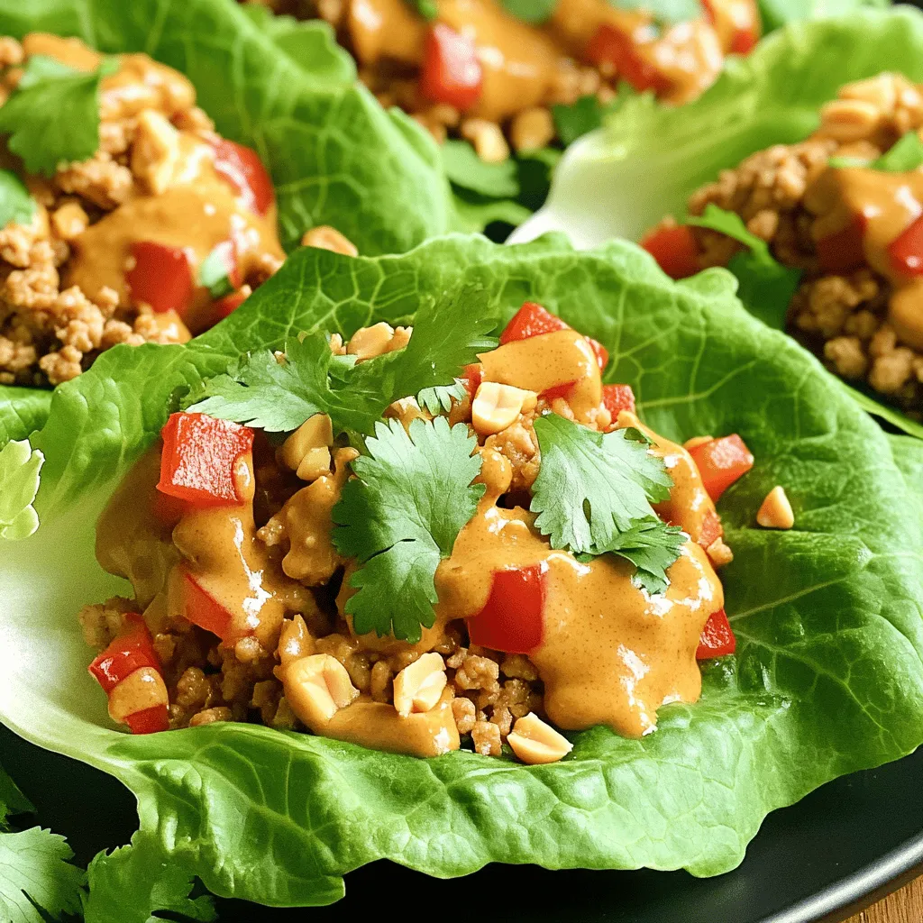 To make these wraps, you will need: - 1 lb ground chicken - 1/4 cup creamy peanut butter - 2 tablespoons soy sauce (or tamari for gluten-free) - 1 tablespoon brown sugar or honey - 1 tablespoon rice vinegar - 1 tablespoon sesame oil - 1 clove garlic, minced - 1 teaspoon fresh ginger, grated - 1/2 red bell pepper, finely diced - 1/2 cup shredded carrots - 1/4 cup chopped green onions - 1 head of butter or romaine lettuce, leaves separated These ingredients create a tasty and satisfying filling for the wraps. To elevate your wraps, consider these garnishes: - Chopped cilantro - Crushed peanuts These add flavor and crunch to each bite. You can easily adjust some ingredients to fit different diets. For a gluten-free option, use tamari instead of soy sauce. If you're vegan, swap the ground chicken for crumbled tofu or lentils. You can also replace peanut butter with almond or sunflower seed butter for nut-free diets. These changes keep the dish tasty while meeting your needs. First, heat a large skillet over medium heat. Add 1 pound of ground chicken. Cook the chicken for 5-7 minutes. As it cooks, break it apart with a spatula. Cook until it is well-browned and no longer pink. This step is key for great flavor. While the chicken cooks, grab a mixing bowl. Add 1/4 cup of creamy peanut butter. Then, add 2 tablespoons of soy sauce or tamari for a gluten-free option. Stir in 1 tablespoon of brown sugar or honey and 1 tablespoon of rice vinegar. Next, pour in 1 tablespoon of sesame oil. Mince 1 clove of garlic and grate 1 teaspoon of fresh ginger. Add these to the bowl. Whisk everything together until smooth. This sauce brings richness to your wraps. Once the chicken is cooked, pour the peanut sauce over it. Stir continuously for 2-3 minutes. Make sure the chicken is evenly coated. Next, add 1/2 diced red bell pepper and 1/2 cup of shredded carrots. Stir well and let them heat for 1-2 minutes. Remove from heat and fold in 1/4 cup of chopped green onions. These add a fresh crunch. To assemble, take a lettuce leaf and place a scoop of chicken filling in the center. Top with chopped cilantro and crushed peanuts for texture. Gently fold the sides of the lettuce over the filling to create your wrap. Enjoy every delicious bite of your Minute Thai Peanut Chicken Lettuce Wraps! To cook chicken well, use a large skillet. Heat it over medium heat and add one pound of ground chicken. Cook it for about five to seven minutes. Break the chicken apart with a spatula as it cooks. Look for a nice golden color. This shows that the chicken is fully cooked. Make sure there are no pink spots left. This keeps your meal safe and tasty. For extra flavor, add more ingredients. Try a splash of lime juice for brightness. You could also use a bit of sriracha for heat. Fresh herbs like mint or basil can add a nice touch. Feel free to mix in more veggies too. Chopped cucumbers or shredded cabbage work well. These tweaks make the dish more exciting and flavorful. To serve your wraps beautifully, use a large platter. Lay out the lettuce wraps neatly. Garnish with extra cilantro and crushed peanuts on top. This adds color and texture. You can also add a small bowl of peanut sauce on the side. It gives guests a chance to dip as they eat. A vibrant display makes the meal even more inviting! {{image_4}} If you want a meat-free version of these wraps, you have great options. Substitute the ground chicken with crumbled tofu or tempeh. Both options soak up the flavors well. For a nutty taste, consider using chickpeas. Just mash them lightly before mixing. Replace peanut butter with sunflower seed butter for a nut-free option. This keeps the dish creamy and smooth while making it safe for nut allergies. You can switch up the protein in these wraps easily. Ground turkey or pork works well and offers new flavors. For a seafood twist, try shrimp or crab. Just cook the shrimp until they turn pink and tender. If you prefer a plant-based option, use lentils or black beans. They add protein and fiber, making the dish hearty and healthy. Want to kick up the heat? Add chili flakes or sriracha to the peanut sauce. Start with a small amount and taste as you go. If you want it milder, leave out any spicy elements. You can also serve with sliced jalapeños on the side. This way, everyone can adjust the spice to their liking. To keep your Minute Thai Peanut Chicken Lettuce Wraps fresh, store them in an airtight container. Make sure to separate the chicken filling from the lettuce leaves. This way, the leaves remain crisp and do not get soggy. Leftover chicken should last up to three days in the fridge. When you want to enjoy the leftovers, reheat the chicken filling in a skillet over medium heat. Stir it often to ensure it heats evenly. It usually takes about 3-5 minutes. You can also microwave it for a quicker option. Just cover the bowl to keep moisture in. If you want to save some for later, freezing is a great option. Place the chicken filling in a freezer-safe bag or container. Remove as much air as possible to prevent freezer burn. It will last up to three months in the freezer. When ready to eat, thaw it overnight in the fridge, then reheat as mentioned above. Yes, you can prepare these wraps ahead of time. Cook the chicken filling first. Once it cools, store it in the fridge. When you are ready to eat, just scoop it into the lettuce leaves. This makes for a quick meal. Just remember to keep the lettuce separate until you are ready to serve. This keeps the leaves fresh and crisp. If you want to skip the lettuce, try using other leaves. You can use cabbage leaves for a crunchy bite. You might also like using collard greens or even rice paper. Each option gives a different flavor and texture. Choose what you like best for your wraps. To make this dish gluten-free, swap soy sauce for tamari. Tamari has a similar taste without gluten. Always check labels on sauces and other ingredients. Some brands may add gluten to their products. By making this 