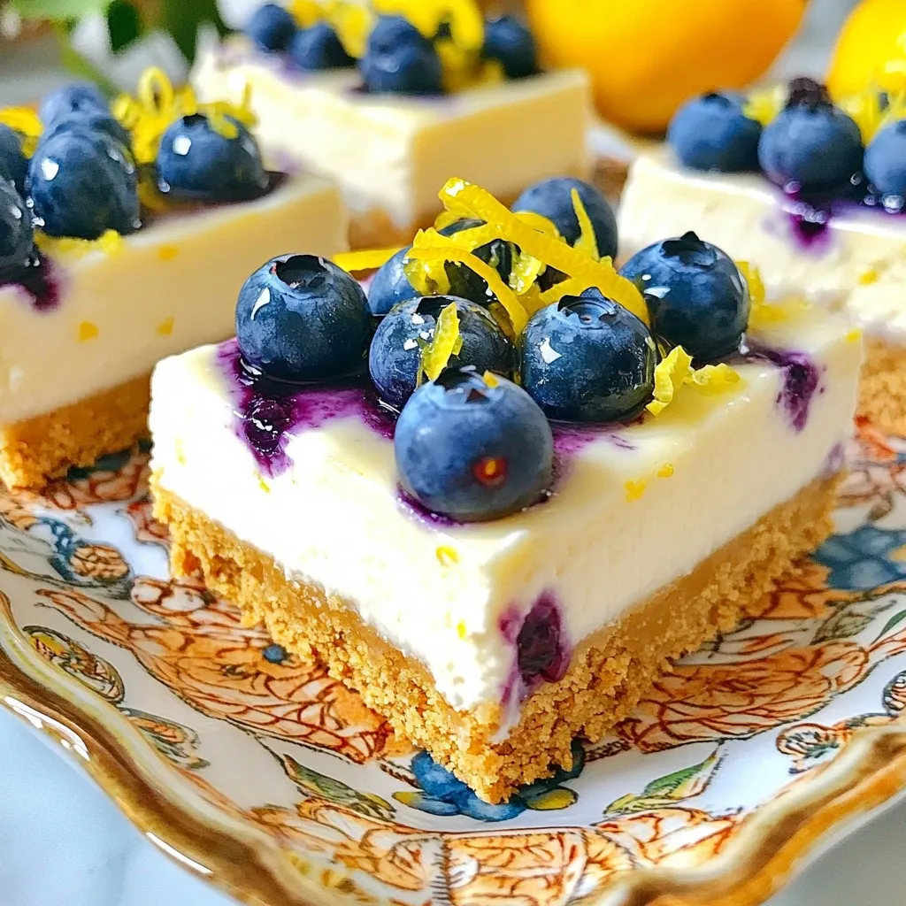 - Präsentationstipps: Serve the cheesecake bars on a decorative platter, garnishing with additional fresh blueberries and a sprinkle of lemon zest to enhance the vibrant colors and freshness of the dish.