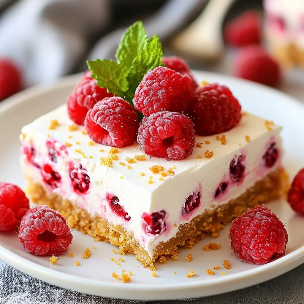 Each ingredient plays a special role in this recipe. The graham cracker crumbs form a sweet and crumbly base. Unsalted butter helps bind this crust together. Sugar adds sweetness to both the crust and filling. Cream cheese gives the bars their rich and creamy texture. Powdered sugar sweetens the filling while keeping it smooth. Vanilla extract adds aroma and depth. Fresh raspberries provide a tart flavor that balances the sweetness. Heavy whipping cream makes the filling light and airy. Lemon juice brightens the taste and enhances the flavors. A pinch of salt rounds out the sweetness.