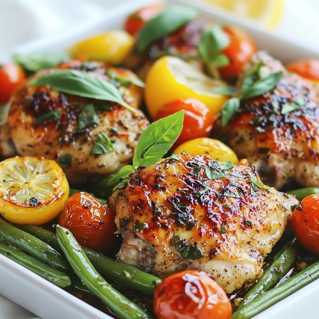 A delicious and easy one-pan meal featuring marinated chicken thighs, green beans, and cherry tomatoes, perfect for a weeknight dinner.