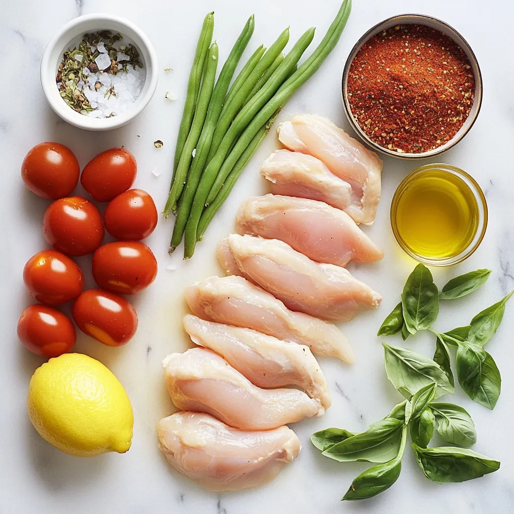 Gathering fresh ingredients is key to this dish. You want vibrant green beans and juicy cherry tomatoes. The chicken thighs should be tender and flavorful. Fresh garlic adds a nice kick. Each spice plays a role, like the smoked paprika, which gives warmth.