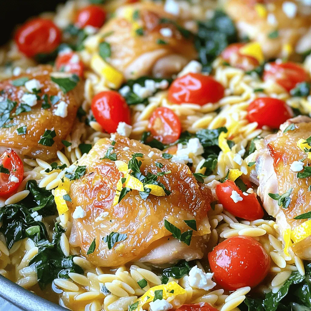 To make One-Pan Greek Lemon Chicken Orzo, gather these items: - 1 lb boneless, skinless chicken thighs, cut into bite-sized pieces - 1 cup orzo pasta - 2 cups chicken broth - 1 medium onion, finely chopped - 3 cloves garlic, minced - 1 cup cherry tomatoes, halved - 1 red bell pepper, diced - 1 cup fresh spinach, roughly chopped - Juice and zest of 1 large lemon - 2 teaspoons dried oregano - 1 teaspoon paprika - 3 tablespoons olive oil - Salt and black pepper to taste - Fresh parsley, finely chopped (for garnish) - Crumbled feta cheese (optional, for serving) Each ingredient adds flavor and health benefits: - Chicken: Provides protein, which helps build muscle. It keeps you full longer. - Orzo: A type of pasta that offers carbohydrates for energy. - Spinach: Packed with vitamins A and C, it supports your immune system. - Tomatoes: Rich in antioxidants, they help fight disease. - Olive Oil: Contains healthy fats that are good for your heart. - Lemon: High in vitamin C, it aids digestion and boosts immunity. If you have dietary needs, here are some swaps: - Chicken: Use tofu or chickpeas for a vegetarian option. - Orzo: Substitute with quinoa or brown rice for a gluten-free meal. - Spinach: Kale or Swiss chard can work well in place of spinach. - Feta Cheese: Use dairy-free cheese or omit it for a vegan dish. Start by gathering your ingredients. You will need chicken thighs, orzo, chicken broth, onion, garlic, cherry tomatoes, red bell pepper, spinach, lemon, oregano, paprika, olive oil, salt, black pepper, parsley, and feta. Chop the onion and garlic finely. Halve the cherry tomatoes and dice the red bell pepper. Roughly chop the spinach. Cut the lemon in half for juice and zest. 1. Heat three tablespoons of olive oil in a large skillet over medium heat. Wait until the oil shimmers. 2. Add the chopped onion. Sauté it for 3 to 4 minutes until it looks soft and clear. 3. Stir in the minced garlic for about one minute. Watch it closely to avoid burning. 4. Turn the heat up to medium-high and add the chicken pieces. Season them with salt, pepper, oregano, and paprika. Cook for 5 to 7 minutes until browned. 5. Toss in the halved cherry tomatoes and diced red bell pepper. Cook for 2 to 3 minutes until they soften. 6. Add the orzo, chicken broth, lemon juice, and lemon zest. Mix well to ensure the orzo is covered with liquid. 7. Bring it to a gentle boil. Lower the heat and cover the pan. Let it simmer for 10 to 12 minutes. Stir occasionally to prevent sticking. 8. When the orzo is al dente, fold in the spinach. Let it wilt for 1 to 2 minutes while stirring. Taste and adjust seasoning if needed. 9. Remove the pan from heat and let it sit for a few minutes before serving. - Use a large skillet for even cooking. - Stir the orzo during simmering to avoid clumping. - Check for doneness by tasting the orzo. - If the orzo absorbs too much liquid, add a splash of broth to loosen it up. - Always let the dish sit after cooking. This helps the flavors blend. To make your One-Pan Greek Lemon Chicken Orzo even tastier, use fresh herbs. Fresh parsley or basil adds a bright taste. A squeeze of lemon juice just before serving boosts the dish's zing. Don't skip the lemon zest; it gives a fragrant aroma that enhances every bite. Try marinating the chicken in olive oil, lemon juice, and herbs for an hour before cooking. This adds depth and makes the chicken juicy. One-pan cooking is simple and efficient. Start by prepping all your ingredients first. This saves time and makes cooking smooth. Use a large skillet or sauté pan to give your chicken space to brown. Make sure the pan is hot before adding oil. This helps seal in moisture. Stir occasionally to prevent sticking. If you notice the orzo sticking, add a splash of broth or water. This keeps everything creamy and delicious. Watch out for overcooking the chicken. It should be browned but not dry. Cook it just until it’s no longer pink. When adding the orzo, make sure it’s fully submerged in liquid. If not, it can burn on the bottom. Stir gently to mix everything, but don’t overdo it. Finally, let it rest for a couple of minutes after cooking. This helps the flavors settle and makes for a better meal. {{image_4}} You can make this dish even tastier with more veggies. Consider adding: - Zucchini, sliced - Eggplant, diced - Artichoke hearts - Kalamata olives - Fresh basil or dill These additions bring fresh flavors and colors. Plus, they boost nutrition too! You can mix and match based on what you have. If you want a change from chicken, try these options: - Shrimp for a seafood twist - Firm tofu for a vegetarian meal - Turkey for a leaner protein source Each swap offers a unique taste. Just adjust cooking times for different proteins to ensure they cook well. This dish fits many occasions. For a cozy family dinner, serve it warm with a salad. If you host a party, use small bowls for easy serving. Top with extra feta for a fancy touch! Want a meal prep idea? Pack it in containers for quick lunches. You can enjoy it hot or cold. To store your One-Pan Greek Lemon Chicken Orzo, let it cool first. Then, place it in an airtight container. This keeps the flavors fresh and prevents drying out. You can store it in the fridge for up to three days. Make sure to label the container with the date you made it. This way, you won’t forget! When you're ready to enjoy leftovers, reheat them gently. You can use the microwave or a stovetop. If using a microwave, place the orzo in a bowl and cover it. Heat in short bursts, stirring in between. This helps the heat spread evenly. If you use the stovetop, add a splash of chicken broth or water. Stir over medium heat until warm. This keeps the orzo moist. Freezing is a great option for long-term storage. Portion out the orzo into smaller containers or freezer bags. Make sure to remove as much air as possible. Label each bag with the date. You can freeze it for up to three months. When you want to eat it, thaw it in the fridge ove