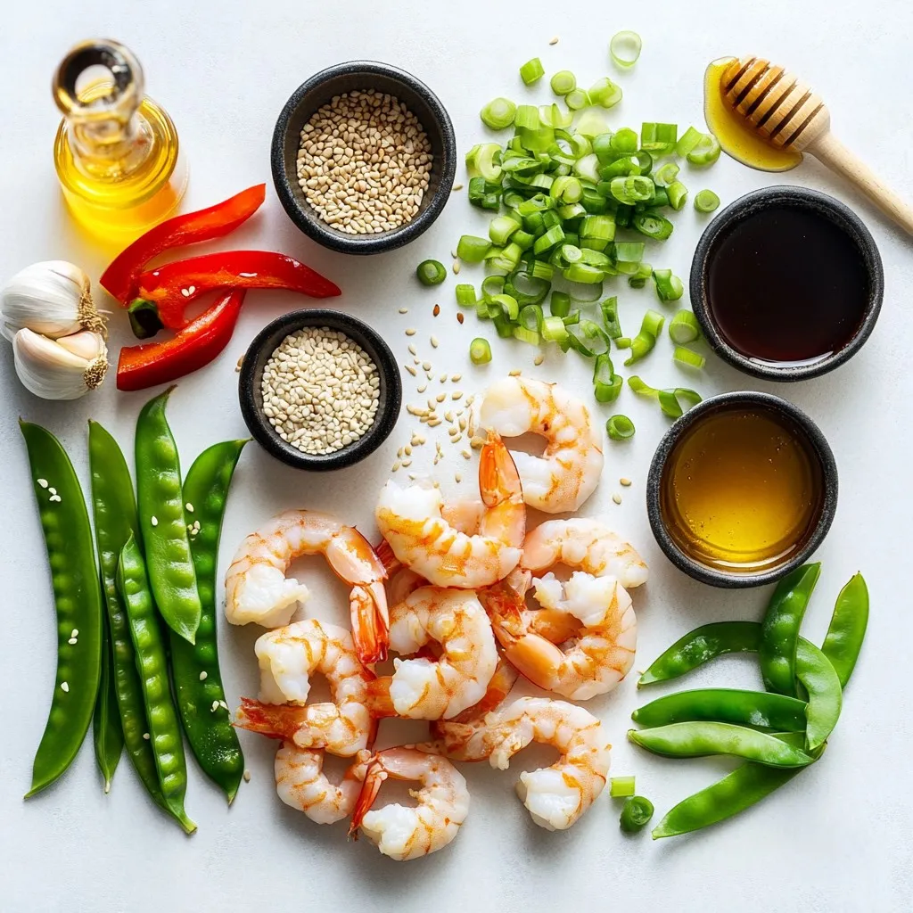 To make One-Pan Honey Garlic Shrimp, you need: - 1 pound large shrimp, peeled and deveined - 3 tablespoons honey - 2 tablespoons soy sauce (or tamari for gluten-free) - 3 cloves garlic, minced - 1 tablespoon fresh ginger, grated - 1 tablespoon olive oil - 1 teaspoon sesame oil - 1 red bell pepper, sliced - 1 cup snap peas - 2 green onions, chopped - Sesame seeds for garnish - Salt and pepper to taste You can swap some ingredients if needed. Here are some ideas: - Use maple syrup instead of honey for a vegan option. - Replace soy sauce with coconut aminos for a soy-free choice. - Any bell pepper works in place of red. Green or yellow will do! - If you lack snap peas, try green beans or broccoli. - Fresh ginger is best, but ground ginger can work in a pinch. If you need to convert measurements, here are some basic tips: - 1 tablespoon equals 3 teaspoons. - 1 cup equals 16 tablespoons. - For weight, 1 pound equals 16 ounces. - If using metric, 1 tablespoon is about 15 milliliters. - Always use a kitchen scale for the best accuracy with shrimp. {{ingredient_image_1}} To start, grab a small mixing bowl. In it, whisk together three tablespoons of honey, two tablespoons of soy sauce, three minced garlic cloves, and one tablespoon of grated ginger. This mix will be your honey garlic sauce. Set it aside for later. This sauce brings a sweet and savory kick to the dish. Next, take a large pan or skillet and heat one tablespoon of olive oil and one teaspoon of sesame oil over medium-high heat. Once the oils are hot, add one sliced red bell pepper and one cup of snap peas to the pan. Sauté these veggies for about three to four minutes. You want them tender but still crisp. After that, remove them from the pan and set them aside. This step adds color and crunch to your meal. In the same pan, add one pound of large shrimp, making sure they are peeled and deveined. Season them with salt and pepper. Cook the shrimp for about two to three minutes. Stir them occasionally. You want them to turn pink and opaque. Once they look good, pour your prepared honey garlic sauce over the shrimp. Stir well to coat them evenly. Cook for an additional one to two minutes until the sauce thickens a bit. Finally, return the sautéed bell pepper and snap peas to the pan. Gently mix everything together. This final touch combines all the flavors beautifully. To cook shrimp just right, use fresh or thawed shrimp. Start by heating your pan on medium-high heat. When the pan is hot, add olive oil and sesame oil. This mix gives your shrimp flavor and helps them brown. Season the shrimp with salt and pepper before cooking. Cook them for about 2-3 minutes. They should turn pink and opaque. Don't overcook them; they can become tough. Remove the shrimp from the pan once they are done. To boost the taste of your dish, use the honey garlic sauce. Whisk together honey, soy sauce, minced garlic, and grated ginger. This sauce adds sweet and savory notes. You can customize it! Try adding a dash of red pepper flakes for heat. Fresh herbs like cilantro or basil can also enhance flavor. Just sprinkle them on top before serving. I love to serve One-Pan Honey Garlic Shrimp over jasmine rice or quinoa. This adds a nice texture and absorbs the sauce well. You can also pair it with steamed broccoli or a fresh salad. For a colorful touch, add sliced avocado or cherry tomatoes. A wedge of lime on the side brightens the dish. Don't forget to sprinkle sesame seeds and green onions for a crunchy finish! Pro Tips Marinate for Flavor: For even more flavor, marinate the shrimp in the honey garlic sauce for 15-30 minutes before cooking. This will enhance the taste and tenderness of the shrimp. Adjust the Heat: If you enjoy a spicy kick, consider adding a pinch of red pepper flakes or a splash of sriracha to the honey garlic sauce for a delightful heat contrast. Veggie Variations: Feel free to swap in your favorite vegetables. Broccoli, zucchini, or carrots can work well in this dish, just be sure to adjust cooking times accordingly. Perfect Pairings: This dish pairs wonderfully with jasmine rice or quinoa, and a squeeze of fresh lime juice adds a bright finishing touch. {{image_2}} You can easily add more veggies to your honey garlic shrimp. Bell peppers, snap peas, and broccoli work great. Just sauté them first, as in the recipe. Then, add them back to the pan with the shrimp. This makes the dish colorful and even tastier. You can mix and match vegetables based on what you like or have on hand. This dish is simple to make gluten-free. Use tamari instead of soy sauce. This keeps the flavor while avoiding gluten. You can also skip any dairy in your sides. Serve it with rice, quinoa, or a green salad. You still get that sweet, savory taste without any worry about gluten or dairy. If you like heat, add some spice! You can mix in red pepper flakes or a dash of sriracha to the honey garlic sauce. Start with a small amount, taste it, and add more if you want. This adds a nice kick to the sweet and savory combo. Your taste buds will thank you for the extra flavor! To store your One-Pan Honey Garlic Shrimp, let it cool first. Place the shrimp in an airtight container. Make sure it is sealed well. You can keep it in the fridge for up to three days. This keeps the shrimp fresh and tasty. If you have rice or veggies with it, store them separately. This will help prevent sogginess. When you are ready to enjoy leftovers, reheat the shrimp gently. You can use a pan over low heat. Add a splash of water or broth for moisture. Stir often to avoid overcooking. You can also microwave it in a bowl. Cover it with a lid or a paper towel. Heat in short bursts, checking every 30 seconds. This will keep the shrimp juicy. You can freeze One-Pan Honey Garlic Shrimp as well. Place it in a freezer-safe bag or container. Make sure to remove as much air as possible. Label the bag with the date. It can stay in the freezer for up to three months. When you are ready to eat it, thaw it in 