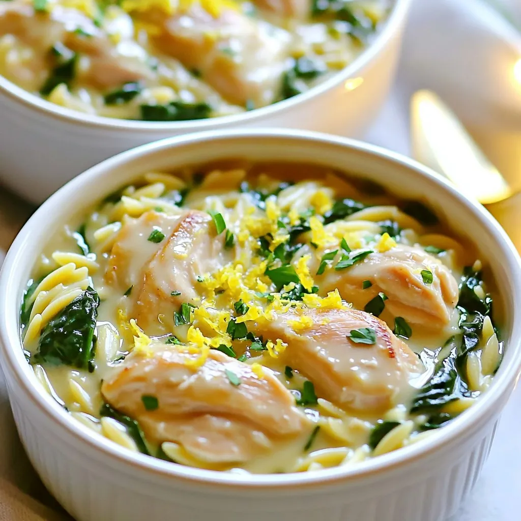 - 1 lb boneless, skinless chicken thighs, diced - 1 cup orzo pasta - 4 cups low-sodium chicken broth - 1 cup heavy cream - Zest and juice of 1 lemon - 1 cup fresh spinach, roughly chopped - 3 cloves garlic, minced - 1 small onion, finely diced - 1 teaspoon dried oregano - Sea salt and freshly cracked black pepper, to taste - 2 tablespoons olive oil When you gather these ingredients, you set yourself up for a delicious meal. The chicken thighs give a juicy base. Orzo pasta adds a nice texture. Chicken broth brings depth and flavor. Heavy cream makes it rich and creamy. Lemon zest and juice brighten the dish. Spinach adds color and nutrients. Garlic and onion add a lovely fragrance and taste. Dried oregano gives an earthy note. Sea salt and pepper round out the flavors. Olive oil helps cook the chicken to perfection. Each ingredient plays a role. They work together to create a delightful one-pot meal. Browning the Chicken Thighs First, heat two tablespoons of olive oil in a large pot. When the oil is warm, add one pound of diced chicken thighs. Cook them for about five to seven minutes. You want the chicken to turn golden brown. This step adds great flavor. Seasoning Tips While cooking, sprinkle sea salt, black pepper, and one teaspoon of dried oregano over the chicken. These spices will give your dish a nice taste. Make sure to stir the chicken often to cook evenly. After browning, set the chicken aside so it does not overcook. Cooking Onion and Garlic In the same pot, add one small diced onion. Sauté it for three minutes until it feels soft and smells good. Next, add three minced garlic cloves. Cook for another minute but watch it closely. You do not want the garlic to burn; it can taste bitter. Incorporating Chicken Broth Now, pour in four cups of low-sodium chicken broth. Bring this mix to a gentle boil. This will help flavor the orzo. Timing for Al Dente Orzo Once boiling, stir in one cup of orzo pasta. Let it cook for eight to ten minutes. Stir occasionally to keep it from sticking. You want the orzo to be al dente, which means it should be firm but not hard. Adding Heavy Cream and Lemon After the orzo cooks, lower the heat. Stir in one cup of heavy cream, the zest of one lemon, and the juice of that lemon. This will make the dish creamy and bright. Stirring in Spinach Now, return the browned chicken to the pot. Add one cup of roughly chopped spinach. Gently fold it in until it wilts. This adds color and nutrients to your dish. Adjusting Seasonings Taste your creamy orzo. You might want to add more sea salt or black pepper to make it just right. Allowing to Sit Take the pot off the heat and let it sit for a few minutes. This resting time helps the mixture thicken. Now, it's ready to serve! When you make One Pot Creamy Lemon Chicken Orzo, the cream is key for that rich texture. If you want it creamier, add more heavy cream, but keep it balanced. Start with half a cup more. This way, you can taste as you go. If you need a lighter option, try using half-and-half or Greek yogurt. They can give you a nice creaminess without being too heavy. Just remember, Greek yogurt should be stirred in at the end. To get the best flavor, seasoning is very important. Always taste as you go. Add salt and pepper in small amounts. You can always add more, but you can’t take it out. Fresh herbs make a huge difference. Add fresh parsley or basil for a bright finish. You can mix them in right before serving for the best flavor. For a great presentation, serve the creamy orzo in shallow bowls. Top each bowl with fresh parsley and a little lemon zest. This adds a pop of color and flavor. As for sides, a simple green salad works well. Steamed veggies, like broccoli or green beans, are also good choices. They add a nice crunch and color to your meal. {{image_4}} Using Different Proteins You can switch chicken for turkey or shrimp. Both options work well. Turkey gives a nice flavor, while shrimp cooks fast. Just adjust cooking times for each. Gluten-Free Alternatives For a gluten-free dish, use gluten-free orzo or rice. Both options will keep the creamy texture. Make sure to check the broth for gluten, too. Adding Additional Veggies You can add more veggies like bell peppers or mushrooms. These add color and nutrients. Just sauté them along with the onion. Spicing it Up If you want heat, add red pepper flakes. A small amount brings a nice kick. You can also mix in fresh herbs like basil or thyme for extra flavor. Vegan Options To make this dish vegan, swap chicken for chickpeas or tofu. Use coconut cream instead of heavy cream. This keeps the rich flavor. Lower-Calorie Modifications For fewer calories, reduce the cream or use low-fat versions. You can add more broth to keep the dish creamy but lighter. - Storing Leftovers: Place any leftover creamy lemon chicken orzo in an airtight container. It stays fresh in the fridge for up to three days. Make sure it cools down before sealing it in the container. This keeps it from getting soggy. - Reheating Tips: When you’re ready to eat, reheat your orzo on the stove. Add a splash of chicken broth or cream to help bring back its creaminess. Stir it over low heat until warmed through. You can also microwave it in short bursts, stirring in between. - Best Practices: To freeze, let the dish cool completely. Then, transfer it to a freezer-safe container. Press out any air before sealing. This helps prevent freezer burn. It can last up to two months in the freezer. - Thawing and Reheating: To enjoy, thaw it overnight in the fridge. Reheat in a pot with a little broth or cream. Stir frequently until it’s hot throughout. - How Long It Lasts: When stored properly, the creamy lemon chicken orzo lasts about three days in the fridge and two months in the freezer. - Signs of Spoilage: Look for mold or an off smell. If it smells sour or looks strange, it’s best to toss it. Always trust your senses when deciding if food is safe to eat. You can use other pasta types. Here are so