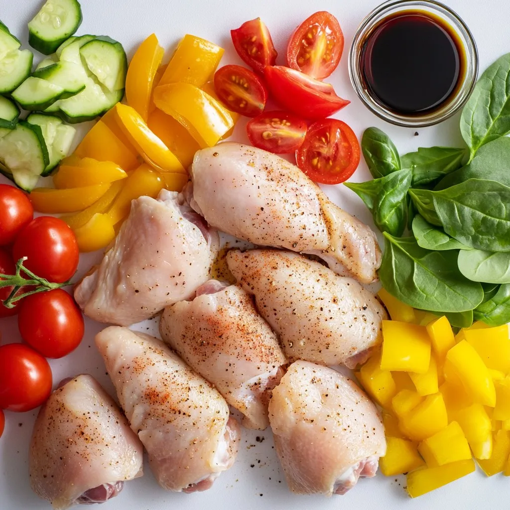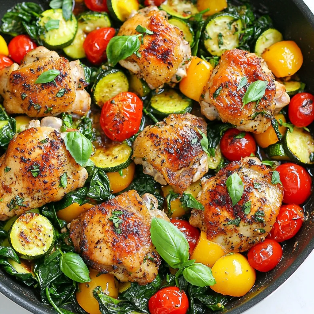 A quick and healthy one-skillet meal featuring chicken thighs and colorful vegetables.
