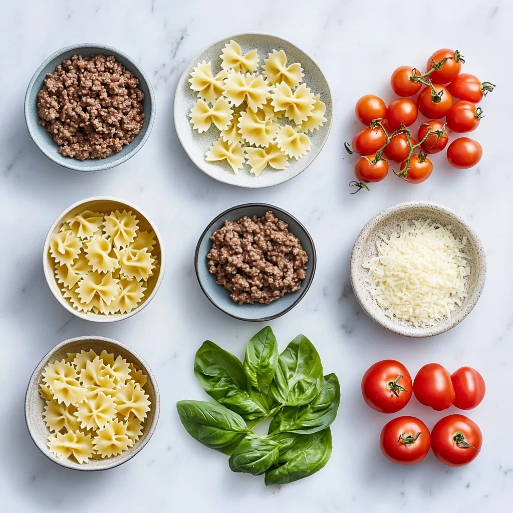 Gathering the right ingredients is key to making Parmesan Garlic Beef Bowtie Pasta. Start with bowtie pasta, which gives a fun shape and holds sauce well. Ground beef adds richness and flavor. Use fresh garlic and onion for a tasty base. Spinach and cherry tomatoes bring freshness and color to the dish.