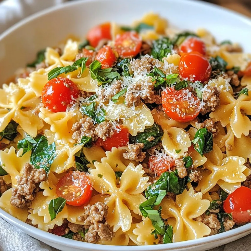 Savor the deliciousness of Parmesan Garlic Beef Bowtie Pasta, an easy pasta dish that's perfect for weeknight dinners! This creamy beef pasta combines tender bowtie pasta with flavorful ground beef, fresh spinach, and cherry tomatoes, all coated in a luscious Parmesan sauce. Discover the joy of one-pot beef pasta cooking that saves time and effort! Try this recipe today and make mealtime a breeze. #ParmesanGarlicBeefPasta #BowtiePastaRecipes #EasyPastaDishes #OnePotBeefPasta