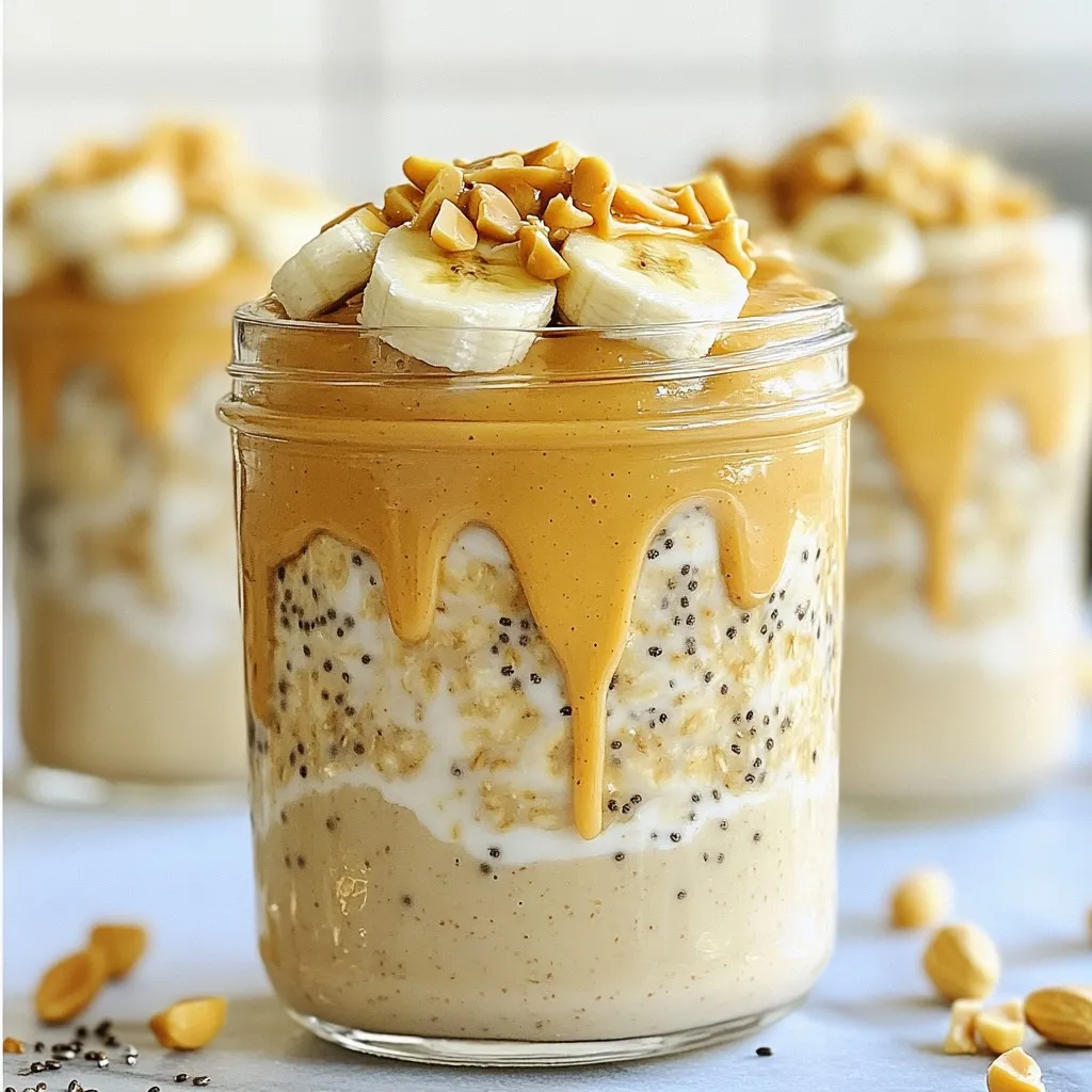 - 1 cup rolled oats - 2 tablespoons creamy peanut butter - 1 ripe banana, mashed - 1 cup almond milk (or any preferred milk) - 1 tablespoon chia seeds - 1 tablespoon honey or maple syrup (optional) - 1/2 teaspoon vanilla extract - A pinch of salt - Sliced banana and chopped peanuts for garnish For this recipe, I measure everything carefully. Use a standard cup for oats and milk. For peanut butter and honey, a tablespoon works well. It helps to get the right balance. This ensures your oats turn out creamy and tasty. You can customize your oats! Try adding: - A sprinkle of cinnamon for warmth. - A handful of berries for a fruity twist. - A scoop of protein powder for extra energy. These add-ins can make your overnight oats even more special. Enjoy exploring new flavors! {{ingredient_image_1}} Start by taking a medium bowl. Add 1 cup of rolled oats. Next, add 1 tablespoon of chia seeds and a pinch of salt. Mix these dry ingredients well. This step helps the flavors blend. Now, grab a separate bowl. Whisk together 1 cup of almond milk, 2 tablespoons of creamy peanut butter, and 1 ripe banana that you have mashed. If you want it sweeter, add 1 tablespoon of honey or maple syrup. Don’t forget to add 1/2 teaspoon of vanilla extract. Mix until it’s smooth and creamy. Pour the wet mixture into the bowl with dry ingredients. Stir them together until everything is mixed well. Make sure all the oats are coated with the wet mixture. This helps the oats soak up the flavors overnight. Divide the mixture into two jars or containers. Secure the lids tightly. Place them in the fridge overnight, or for at least 4 hours. This step allows the oats to absorb the liquid and soften. In the morning, take out your jars. Give the oats a good stir. If they seem too thick, add a splash of almond milk. Top each serving with sliced banana and chopped peanuts. This adds a nice crunch and fresh flavor. Enjoy your tasty breakfast! You can change how sweet your oats taste. If you like them sweeter, add more honey or maple syrup. You can also use a ripe banana. The riper the banana, the sweeter the oats will be. Just remember to taste as you go! To get the best texture, mix the oats and chia seeds well. This helps them soak up the milk evenly. If your oats are too thick in the morning, just stir in a splash of almond milk. This will make them creamy and smooth again. Presentation matters! Serve your oats in clear glass jars. You can see the layers of oats, banana, and peanut butter. For extra flair, drizzle some peanut butter on top. Finish with sliced banana and chopped peanuts for a pop of color and crunch. This makes your breakfast look as good as it tastes! Pro Tips Use Ripe Bananas: The riper the banana, the sweeter and more flavorful your overnight oats will be. Look for bananas with brown spots for optimal taste. Adjust Sweetness: Depending on your preference, feel free to adjust the amount of honey or maple syrup. You can always add more sweetness in the morning if needed. Experiment with Toppings: Get creative with toppings! Try adding nuts, seeds, or even a sprinkle of cinnamon for added flavor and texture. Make It Ahead: This recipe is perfect for meal prep! Make a batch for the week and store them in the fridge for quick, healthy breakfasts. {{image_2}} You can enjoy Peanut Butter Banana Overnight Oats without nuts. Use sunflower seed butter instead of peanut butter. It gives a similar creamy texture. You can also try tahini for a unique flavor. Sunflower seed butter is great for kids with nut allergies. If you want a dairy-free option, almond milk works well. You can also use oat milk or coconut milk. Both will add a different taste. Make sure to check the labels for added sugars. This way, you keep it healthy and tasty. You can mix up the flavors of your overnight oats. Add cocoa powder for a chocolate twist. A sprinkle of cinnamon will give warmth and spice. Want something fruity? Toss in some berries or diced apples. Each adds a new layer of flavor. Enjoy experimenting to find your favorite! You can store your Peanut Butter Banana Overnight Oats in the fridge. Use airtight jars or containers. This keeps them fresh and safe to eat. Make sure to cover them well. For the best taste, eat your oats within 3 days. The oats absorb liquid and soften over time. If you notice any change in smell or color, it's best to discard them. Always check for freshness before eating. You can enjoy these oats cold or warm. If you prefer them warm, microwave them for about 30 seconds. Stir well and check the temperature. Add a splash of almond milk if they seem too thick. Enjoy your tasty breakfast! Yes, you can use quick oats. Quick oats cook faster and absorb liquid quickly. The texture will be softer than rolled oats, but they will still taste great. If you want a creamier dish, quick oats work well. Just remember, they may become mushy if left too long. These oats last up to five days in the fridge. Make sure to store them in airtight containers. The flavors will blend, and the oats will soften more over time. If you notice any off smells, it’s best to toss them out. Absolutely! This recipe is perfect for meal prep. You can make several jars at once. Just follow the recipe and store them in the fridge. They make a great grab-and-go breakfast for busy mornings. Yes, feel free to use any nut butter you like. Almond butter, cashew butter, or sunflower seed butter are great options. Each nut butter will bring a unique flavor. Just choose one that fits your taste and dietary needs. This blog post covered the key steps to make delicious Peanut Butter Banana Overnight Oats. You learned about the ingredients, measurements, and optional add-ins. I shared tips for sweetness, texture, and presentation. You also discovered fun variations and important storage info. These oats are perfect for quick meals and easy to customize. Feel free to experiment with your favorite flavors. Trust that with these tips, you will create tasty, heal