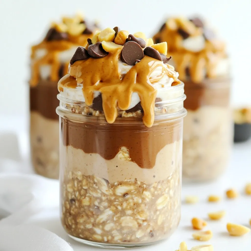 To make Peanut Butter Cup Overnight Oats, you will need: - 1 cup rolled oats - 2 cups almond milk (or your preferred milk) - 2 tablespoons natural peanut butter - 1 tablespoon cocoa powder - 2 tablespoons honey or maple syrup (adjust to taste) - 1 teaspoon vanilla extract - A pinch of salt - 1/4 cup mini chocolate chips (plus extra for topping) - Chopped peanuts (for garnish) These ingredients blend well together. They create a tasty and filling breakfast. You can swap ingredients to fit your needs. Here are some ideas: - Use oat milk or soy milk instead of almond milk for nut allergies. - Replace honey with agave syrup for a vegan option. - If you avoid gluten, choose gluten-free oats. - Swap mini chocolate chips with dark chocolate or carob chips. These substitutes still keep the dish delicious. Each ingredient has its own benefits. Here’s a quick look: - Rolled oats: High in fiber, they help keep you full longer. - Almond milk: Low in calories and rich in vitamins like E. - Peanut butter: Packed with protein, it provides energy and flavor. - Cocoa powder: Offers antioxidants and adds a rich chocolate taste. - Honey or maple syrup: Natural sweeteners that provide quick energy. - Mini chocolate chips: Adds fun and a touch of sweetness. - Chopped peanuts: Gives a nice crunch and extra protein. With these ingredients, your overnight oats are not just tasty, but also good for you! {{ingredient_image_1}} To make Peanut Butter Cup Overnight Oats, first, gather your ingredients. You will need rolled oats, almond milk, peanut butter, cocoa powder, honey or maple syrup, vanilla extract, salt, mini chocolate chips, and chopped peanuts. 1. In a medium mixing bowl, add 1 cup of rolled oats and 2 cups of almond milk. Don’t forget a pinch of salt! Stir until the oats soak up the milk. 2. In a separate bowl, take 2 tablespoons of natural peanut butter. Add 1 tablespoon of cocoa powder, 2 tablespoons of honey or maple syrup, and 1 teaspoon of vanilla extract. Whisk these together until they blend well. 3. Pour the peanut butter mixture into the oats. Stir everything together until it is fully mixed. 4. Now, fold in 1/4 cup of mini chocolate chips for that sweet touch. 5. Divide the mixture into jars or containers. Seal them tightly with lids. 6. Place the jars in the fridge overnight. If you can't wait, let them sit for at least 4 hours. 7. When you are ready to eat, stir the oats. You can add a splash of milk for a creamier texture. 8. Lastly, top with extra mini chocolate chips and chopped peanuts for extra crunch. Mixing is key to a great texture. Use a whisk for the peanut butter mixture. This helps to break down the peanut butter and blend it smoothly. When combining it with the oats, use a spatula or a spoon. This method helps keep the oats intact. For storage, use clear glass jars. They let you see the colorful layers. Mason jars work great, but any airtight container will do. Make sure the lids are sealed tightly. This keeps your oats fresh and tasty. To make perfect overnight oats, follow these tips: - Use rolled oats: They soak well and give a nice texture. - Choose your milk: Almond milk works great, but any milk is fine. - Mix ingredients well: Ensure all ingredients blend smoothly for the best taste. - Let them sit: Refrigerate for at least four hours. Overnight is best! You can easily adjust this recipe for different diets: - Vegan: Use maple syrup and plant-based milk. - Gluten-free: Make sure your oats are certified gluten-free. - Low-sugar: Cut back on honey or syrup and add more cocoa powder. - Protein boost: Stir in protein powder for an extra kick. Avoid these common pitfalls: - Too much liquid: If you add too much milk, your oats can become mushy. Stick to the measurements. - Skipping the salt: A pinch of salt enhances flavors. Don’t skip it! - Not stirring enough: If you don’t mix well, you may end up with dry spots. - Skipping toppings: Garnishes like chopped peanuts and chocolate chips make your oats pop! Pro Tips Use Old-Fashioned Rolled Oats: For the best texture, stick with old-fashioned rolled oats instead of quick oats, which can become mushy. Customize Your Sweetness: Adjust the amount of honey or maple syrup to your taste preference; you can also use a sugar substitute if desired. Experiment with Nut Butters: Try different nut butters like almond or cashew for a unique flavor twist on your overnight oats. Store in Air-Tight Containers: To maintain freshness, use air-tight jars or containers, and consume within 3-5 days for optimal taste. {{image_2}} You can mix and match flavors for your Peanut Butter Cup Overnight Oats. Try adding a spoonful of almond butter for a nutty twist. Or, swap cocoa powder with carob powder for a different taste. You can even add a splash of coffee for a mocha vibe. Experiment with spices like cinnamon or nutmeg to create warmth. Each change brings a new flavor to your breakfast. Boost the nutrition of your oats with simple add-ins. Chia seeds add fiber and omega-3s. A scoop of protein powder gives you energy throughout the day. You can also mix in Greek yogurt for creaminess and extra protein. Try adding sliced bananas or berries for natural sweetness and vitamins. These small changes make your oats even more filling. Use seasonal fruits and nuts to keep your oats fresh and exciting. In spring, try strawberries or cherries. Summer is perfect for peaches or blueberries. In fall, add apple slices or pumpkin puree with spices. Winter calls for hearty nuts like walnuts or pecans. These fruits and nuts not only add flavor but also offer vital nutrients. To store your peanut butter cup overnight oats, use airtight containers. I like using glass jars. They keep the oats fresh and make it easy to see what’s inside. Make sure to seal the lids tightly after filling them. This will prevent any odors from your fridge affecting your oats. Prepared overnight oats can last for up to five days in the fridge. It’s best to eat them within this time 