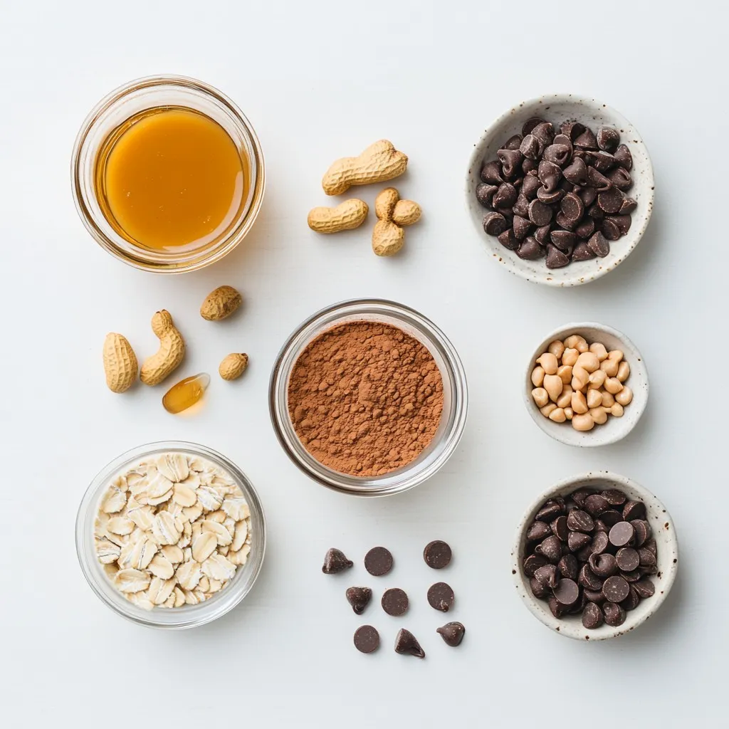 To make Peanut Butter Cup Overnight Oats, first, gather your ingredients. You will need rolled oats, almond milk, peanut butter, cocoa powder, honey or maple syrup, vanilla extract, salt, mini chocolate chips, and chopped peanuts.
