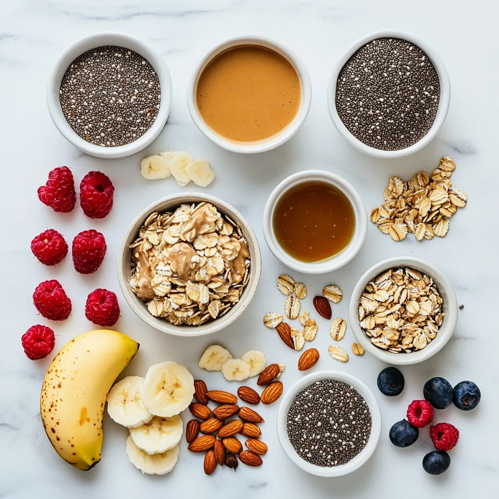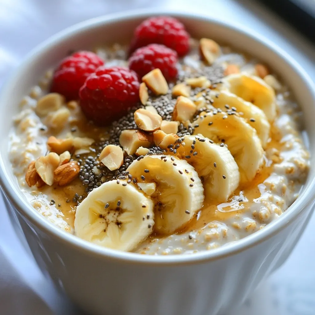 To make Protein Peanut Butter Overnight Oats, you need simple and healthy ingredients. Here’s what you’ll need: - 1 cup rolled oats - 2 tablespoons natural peanut butter - 1 scoop vanilla protein powder - 1 cup almond milk (or any milk of choice) - 1 tablespoon chia seeds - 1 tablespoon honey or maple syrup (optional for sweetness) - 1 banana, sliced - A pinch of salt - Topping suggestions: chopped nuts, seeds, or fresh berries Using these ingredients, you can create a filling and tasty breakfast. The oats provide fiber, while peanut butter adds healthy fats and protein. The protein powder boosts the protein content, making this meal great for energy. Chia seeds add texture and omega-3 fats. You can adjust sweetness with honey or maple syrup. Finally, fresh banana slices and toppings make your oats delicious and fun! {{ingredient_image_1}} First, grab a large mixing bowl. Now, add 1 cup of rolled oats. Next, include 1 scoop of vanilla protein powder. Then, add 1 tablespoon of chia seeds. Finally, sprinkle in a pinch of salt. Mix these dry ingredients well. Ensure everything blends evenly. Take a separate bowl for the wet mix. In it, whisk together 1 cup of almond milk and 2 tablespoons of natural peanut butter. If you like it sweet, add 1 tablespoon of honey or maple syrup. Mix until smooth and creamy. Now, pour the wet mixture into your dry ingredients. Stir until all the oats are coated. Next, fold in one sliced banana. Save a few banana slices for later if you want. Divide the mixture into two jars or containers. Seal them tightly and place them in the fridge. Let them chill overnight or for at least 4 hours. This helps the oats absorb the liquid. Enjoy the thick and creamy texture in the morning! To get the right thickness, you can adjust the liquid. If your oats are too thick, add more milk. For thinner oats, use less milk. Mixing your ingredients well is key. It helps the oats absorb flavors and liquid evenly. You can sweeten your oats naturally. Honey or maple syrup works great. You can also use mashed banana for sweetness. Think about balancing flavors with toppings. Chopped nuts or fresh berries add texture and taste. When making these oats ahead, storage matters. Use airtight jars to keep them fresh. You can prepare these oats up to four days in advance. They stay good in the fridge for that long. Enjoying a quick breakfast is easy with meal prep! Pro Tips Soak your oats: For a creamier texture, consider soaking the oats for longer than four hours, or even overnight, to ensure they fully absorb the liquid. Customize your sweetness: Adjust the sweetness by adding more or less honey or maple syrup based on your taste preference. Experiment with flavors: Add spices like cinnamon or vanilla extract to elevate the flavor profile of your overnight oats. Prep for the week: Make multiple jars at once for a quick breakfast option throughout the week. Just stir and add toppings in the morning! {{image_2}} You can change up the flavor of your overnight oats easily. Try using different nut butters. Almond butter or cashew butter can add a nice twist. You can also switch the protein powder. Chocolate protein powder gives a rich taste. If you want fruity flavors, try adding strawberries or blueberries. Each choice can change the dish completely. This recipe works for many diets. You can make it gluten-free by choosing gluten-free oats. For a vegan option, use plant-based protein powder and skip honey. For low-carb, use fewer oats and add more seeds or nuts. These changes help fit the recipe into your eating plan. Boost your overnight oats with extras. Chia seeds are great for fiber and omega-3s. You can also add nuts for crunch and protein. Superfoods like hemp seeds or flaxseeds add more nutrients. Each addition improves health and flavor, making your breakfast even better. To keep your Protein Peanut Butter Overnight Oats fresh, use glass jars or plastic containers. Look for containers with tight lids. This helps prevent spills and keeps the oats from drying out. Make sure to fill the jars to the top. This limits the air inside, keeping your oats tasty. Protein Peanut Butter Overnight Oats last in the fridge for about 3 to 5 days. The oats absorb liquid and soften over time. If you notice any off smell or change in color, it’s best to toss them. Always check your oats before eating. Yes, you can freeze overnight oats! Just use freezer-safe containers. Leave some space at the top for expansion. When you’re ready to eat, place them in the fridge overnight to thaw. You can also warm them in the microwave. Just add a splash of milk to restore creaminess. Yes, you can use instant oats. They will cook faster. Instant oats absorb liquid quickly. This means your overnight oats might be softer. If you enjoy a creamier texture, instant oats work well. Absolutely! This recipe is perfect for meal prep. You can make it in advance. Just store the jars in the fridge. They last for up to five days. This makes busy mornings easier and tastier. To make nut-free oats, simply swap peanut butter. You can use sun butter or soy nut butter. These options give similar creaminess and flavor. Check labels to ensure they are nut-free. Protein powder boosts the protein content. This keeps you full longer. It also supports muscle repair and growth. Using protein powder can help balance your meal. You can enjoy a tasty breakfast that fuels your day. Yes, you can add more protein! Here are some ways: - Add extra protein powder. - Mix in Greek yogurt. - Include cottage cheese. These options blend well. They enhance the texture and flavor without being overpowering. This blog post covered how to make protein-packed peanut butter overnight oats. We discussed the key ingredients, step-by-step instructions, and tips for best results. You learned about flavor variations, storage tips, and answered common questions. Now, you have all you need to create a delicious and healthy breakfast. Enjoy customizing it to fit your 