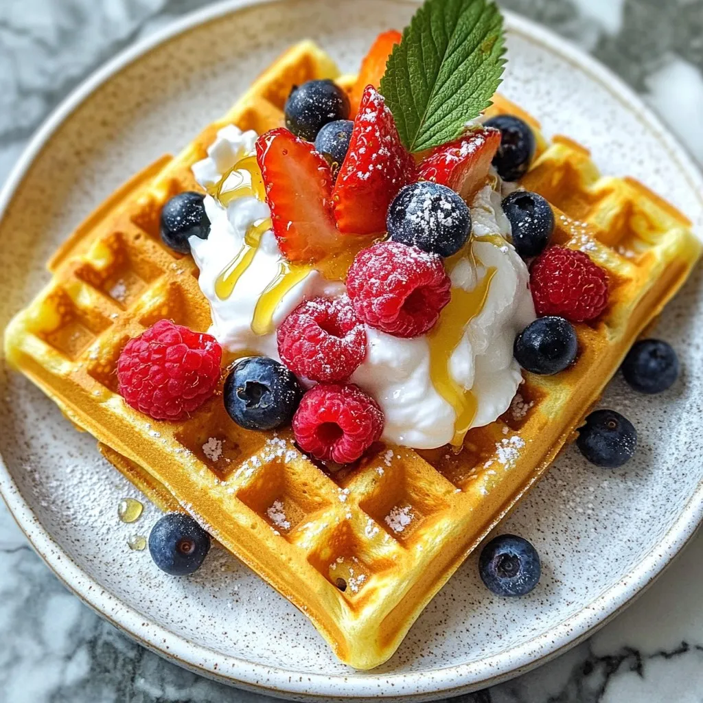 To make these protein waffles, gather these items: - 1 cup rolled oats - 1 scoop protein powder (vanilla or unflavored) - 1 ripe banana, mashed - 2 large eggs - 1/2 cup almond milk (or milk of choice) - 1 tablespoon baking powder - 1 teaspoon vanilla extract - 1/2 teaspoon cinnamon - Pinch of salt These ingredients work together to create a tasty base. The rolled oats give the waffles a nice texture. The protein powder adds a boost of nutrition. You can make your waffles even better with these toppings: - Fresh berries - Greek yogurt - Honey - Maple syrup Adding toppings can change the flavor. Fresh berries bring sweetness and color. Greek yogurt adds creaminess and protein. If you need substitutes, here are some ideas: - Use any milk instead of almond milk. - Swap the banana for applesauce for a different taste. - Replace eggs with flaxseed meal mixed with water for a vegan option. These swaps keep the recipe flexible. You can still enjoy great taste and nutrition! {{ingredient_image_1}} First, you need to preheat your waffle iron. Follow the instructions that come with your iron. This step is key for even cooking. A hot iron helps create crispy edges. You can use a light spray of oil to keep the waffles from sticking. Next, grab a blender or food processor. Add 1 cup of rolled oats. Blend them until they look like flour. This makes your base nice and smooth. Then, add 1 scoop of protein powder, 1 ripe mashed banana, and 2 large eggs. Pour in 1/2 cup of almond milk. Add 1 tablespoon of baking powder, 1 teaspoon of vanilla extract, 1/2 teaspoon of cinnamon, and a pinch of salt. Blend it all together until smooth. Your batter should be thick but easy to pour. Now it’s time to cook! Lightly grease the waffle iron with cooking spray or a bit of oil. Pour the batter in the center, but don’t overfill. Close the lid and cook according to your iron's guide. This usually takes about 3-5 minutes. Watch for the waffles to turn golden brown and crisp. Carefully take them out and keep them warm in a low oven. Repeat until you finish the batter. Enjoy your protein-packed waffles warm, topped with berries, yogurt, or syrup! To get the best texture, blend your oats until they are very fine. This helps make a smooth batter. The batter should be thick but pourable. If it's too thick, add a splash of milk. For fluffier waffles, let the batter sit for five minutes before cooking. This helps it rise better. If you have leftover waffles, let them cool completely. Then, stack them with a piece of parchment paper between each one. Place the stack in a zip-lock bag or airtight container. Store them in the fridge for up to three days. You can also freeze them for up to three months. Just pop them in the toaster or microwave when you want to eat them again. For extra crispy waffles, try these tips. First, preheat your waffle iron well. A hot iron helps create a crispy outside. Second, use a light spray of oil or cooking spray on the iron. This prevents sticking and gives a nice crunch. Lastly, cook the waffles a minute longer if needed. Just watch them closely to avoid burning. Pro Tips Use Fresh Bananas: Ripe bananas not only add sweetness but also enhance the moisture in the waffles, making them fluffier. Experiment with Flavors: Feel free to add different spices like nutmeg or cardamom, or even a scoop of cocoa powder for a chocolatey twist! Perfect Your Waffle Iron Technique: Every waffle iron is different; adjust cooking time as needed to achieve the perfect golden brown without burning. Make Ahead and Freeze: These waffles freeze well! Just pop them in the toaster for a quick breakfast on busy mornings. {{image_2}} You can easily make vegan protein waffles. Just swap the eggs for a flax egg. To make a flax egg, mix one tablespoon of ground flaxseed with three tablespoons of water. Let it sit for five minutes to thicken. Use a plant-based protein powder too, like pea or rice protein. You can also use almond milk or oat milk for a dairy-free option. This keeps your waffles light and fluffy while still packing protein. If you need gluten-free waffles, use gluten-free rolled oats. Blend them until they become flour. This way, you avoid any gluten. You can also try almond flour or coconut flour. Both are great substitutes for a gluten-free option. Make sure your protein powder is gluten-free as well. With these swaps, you can enjoy tasty waffles without the gluten. Want to add some fun flavors? Try a scoop of cocoa powder for chocolate waffles. Just mix it in with the rest of the ingredients. For a fall twist, add pumpkin puree and a touch of nutmeg. This gives your waffles a warm, cozy flavor. You can also toss in mini chocolate chips or chopped nuts for extra texture. These small changes turn basic waffles into something special. These protein waffles pack a punch with protein. Each waffle has about 10-15 grams of protein. This comes from the protein powder and eggs. Protein helps build muscle and keeps you full longer. It also boosts your metabolism. Eating protein in the morning can kickstart your day right. One serving of these waffles is around 200-250 calories. The main sources of calories are from oats, eggs, and banana. Oats give you healthy carbs and fiber. The banana adds natural sweetness and some calories too. This balanced mix keeps your energy steady. - Rolled oats: High in fiber, good for digestion, and helps lower cholesterol. - Banana: Rich in potassium, supports heart health, and adds natural sweetness. - Almond milk: Lower in calories than regular milk and has healthy fats. - Eggs: Packed with vitamins and minerals, eggs aid in muscle repair. - Cinnamon: May help control blood sugar and adds flavor without extra sugar. These ingredients create a tasty meal that fuels your body right. Yes, you can use various protein powders. Whey, casein, or plant-based protein works well. Each type adds a unique flavor and texture. If you choose flavored protein, adjust other flavors in the recipe. Keep 