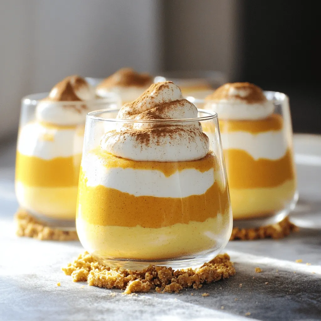 To make these parfaits, you need: - 1 cup pumpkin puree - 8 oz cream cheese, softened - 1/2 cup powdered sugar - 1 teaspoon vanilla extract - 1 teaspoon pumpkin pie spice - 1 cup heavy whipping cream - 1/2 cup crushed graham crackers - 2 tablespoons unsalted butter, melted These ingredients create a rich, creamy mousse that is perfect for fall. For a delightful finish, consider adding: - Whipped cream - Ground cinnamon These toppings not only add flavor but also enhance the look of your parfaits. You can customize your parfaits with: - A pinch of nutmeg for extra warmth - A splash of maple syrup for sweetness - Dairy-free cream cheese for a vegan option Feel free to get creative and adjust the flavors to your liking! Start by getting a large mixing bowl. Add 8 oz of softened cream cheese. Then, pour in 1/2 cup of powdered sugar, 1 teaspoon of vanilla extract, and 1 teaspoon of pumpkin pie spice. Beat this mixture with an electric mixer on medium speed. Keep mixing until it is smooth and creamy. Don’t forget to scrape down the sides of the bowl as you mix. Next, gently fold in 1 cup of pumpkin puree. Use a rubber spatula for this step. Be careful not to overmix. Your goal is to combine everything until it looks smooth. In a separate chilled bowl, pour in 1 cup of heavy whipping cream. Beat it on medium to high speed until soft peaks form. Once your cream is fluffy, slowly fold it into the pumpkin mixture. Use a gentle motion here. You want to keep that airy texture. Keep folding until you see no streaks of whipped cream. Now, let’s build the parfaits! In a small bowl, mix together 1/2 cup of crushed graham crackers and 2 tablespoons of melted unsalted butter. Stir until all the crumbs are coated. Start by spooning a layer of this graham cracker mixture into the bottom of your serving glasses. This forms a nice base. Add a generous scoop of the pumpkin cheesecake mousse on top. Spread it evenly with a spoon. Repeat this layering with more graham cracker and mousse until your glasses are full. Finish with a lovely layer of mousse at the top. Cover the parfaits with plastic wrap and put them in the fridge for at least 2 hours. This chilling time helps the flavors blend and the mousse set. When you are ready to serve, take them out of the fridge. Top each parfait with a swirl of whipped cream and a sprinkle of ground cinnamon for a nice touch. Enjoy your delightful pumpkin cheesecake mousse parfaits! To get a smooth and creamy mousse, follow these steps: - Beat the cream cheese until it is very soft. - Mix in the powdered sugar fully. - Fold in the pumpkin puree gently. - Whip the cream until soft peaks form. - Carefully fold the whipped cream into the pumpkin mix. This keeps the mousse light and fluffy. Layering is key for a good parfait. Start with these tips: - Use clear glasses to show off the layers. - Begin with a layer of graham cracker crumbs. - Add a scoop of mousse, then repeat. - Fill glasses to the top with mousse. - Make sure the last layer is mousse for a nice finish. This way, each bite has flavor and texture. How you present your parfaits matters. Try these ideas: - Top each parfait with whipped cream for a soft look. - Dust with ground cinnamon for a warm touch. - Add a sprinkle of crushed graham crackers on top for crunch. - Use colorful dessert cups to make them pop. These little touches make your parfaits stand out at any gathering. {{image_4}} To make these parfaits gluten-free, I suggest using gluten-free graham crackers. You can also find gluten-free cookies that work well for the base. Just crush them the same way you would with regular graham crackers. This change keeps the crunch while ensuring everyone can enjoy the dessert. If you want a vegan version, swap the cream cheese for a vegan cream cheese alternative. Use coconut cream instead of heavy whipping cream for the mousse. For the sugar, opt for maple syrup or agave to sweeten. These swaps create a rich, creamy texture without dairy. You can add different flavors to your parfaits. For a chocolate twist, mix cocoa powder into the pumpkin mousse. This gives a rich chocolate flavor that pairs well with pumpkin. If you love caramel, drizzle caramel sauce between the layers. It adds sweetness and a lovely contrast to the pumpkin spice. To keep your pumpkin cheesecake mousse parfaits fresh, store them in the fridge. Use an airtight container or cover the serving glasses with plastic wrap. This keeps the air out and prevents drying. The parfaits need at least two hours to chill after you make them. This time helps the flavors mix and the mousse set, so don't rush it. If you want to freeze them, it's best to freeze the mousse and graham cracker layers separately. Parfaits with heavy cream may not freeze well. If you freeze them, let them thaw in the fridge overnight before serving. They may lose some texture but will still taste great. These parfaits can last in the fridge for about three days. After that, the mousse may start to separate. For the best taste and texture, enjoy them within two days. Always check for any changes in smell or texture before eating. If they look or smell off, it's best to throw them away. Yes, you can use fresh pumpkin. Make sure to cook and puree it first. Roast the pumpkin, scoop out the flesh, and blend until smooth. This adds a fresh taste but requires more work than canned puree. You can store these parfaits in the fridge for up to three days. Keep them covered to maintain freshness. The flavors deepen as they sit, making them even more delicious! You can use ricotta cheese or mascarpone as a substitute. Both create a creamy texture. If you want a dairy-free option, try silken tofu blended until smooth. This will change the flavor slightly but still tastes great! You can prepare the mousse and graham cracker layers a day in advance. Assemble the parfaits before serving for the best texture. Just remember to chill them for at least two hours before serving! In this blog post, we expl