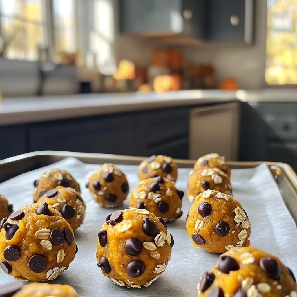 After rolling, place the protein balls on a baking sheet lined with parchment paper. Cover the bowl with a lid or plastic wrap and refrigerate for about 30 minutes. This helps firm up the mixture. Once chilled, serve your tasty energy snacks right away or store them in an airtight container in the fridge for up to a week. Enjoy the blend of pumpkin and chocolate!