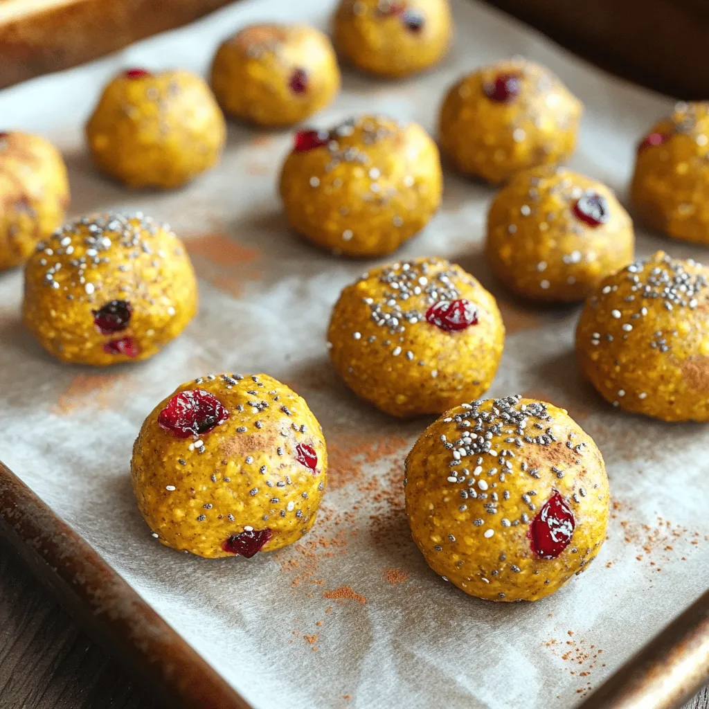 To make these tasty bites, gather these main ingredients: - 1 cup rolled oats - 1/2 cup canned pumpkin puree - 1/3 cup almond butter (or peanut butter) - 1/4 cup honey or maple syrup - 1/2 teaspoon pure vanilla extract - 1/2 cup dried cranberries, chopped - 1/4 cup chia seeds - 1 teaspoon ground cinnamon - 1/2 teaspoon ground nutmeg - A pinch of salt These ingredients work together to create a chewy, flavorful snack. The oats provide fiber, while pumpkin adds moisture and nutrients. You can switch some ingredients if you like. Here are a few options: - Use peanut butter instead of almond butter for a different flavor. - Substitute honey with maple syrup for a vegan option. - Swap dried cranberries with raisins or chopped dates for variety. These tweaks can change the taste but keep the bites healthy. Each ingredient adds its own health perks: - Rolled oats are high in fiber, aiding digestion. - Canned pumpkin is rich in vitamins A and C, supporting your immune system. - Almond butter provides healthy fats and protein, helping you feel full. - Honey or maple syrup gives a natural sweetness without refined sugars. - Chia seeds are packed with omega-3 fatty acids and fiber, promoting heart health. - Cinnamon and nutmeg add flavor and may help regulate blood sugar levels. By choosing these good-for-you ingredients, you create a snack that fuels your day. First, grab a large mixing bowl. Add 1 cup of rolled oats, 1/4 cup of chia seeds, 1 teaspoon of ground cinnamon, 1/2 teaspoon of ground nutmeg, and a pinch of salt. Stir these dry ingredients well with a spoon. Make sure they mix evenly. This helps the flavors blend nicely. In another bowl, whisk together 1/2 cup of canned pumpkin puree, 1/3 cup of almond butter, and 1/4 cup of honey (or maple syrup). Also, add 1/2 teaspoon of pure vanilla extract. Keep whisking until the mixture is smooth and creamy. You want to avoid any lumps. This creamy mix adds moisture and flavor. Next, pour the wet mixture into the dry ingredients. Stir thoroughly until everything combines well. You should see a uniform mix. Now, gently fold in 1/2 cup of chopped dried cranberries. This step adds sweetness and a nice chewy texture. Cover the bowl with plastic wrap. Place it in the fridge for about 30 minutes. Chilling helps the mixture firm up, making it easier to shape. After 30 minutes, scoop out portions with a tablespoon. Roll each portion into small balls. Place them on a parchment-lined baking sheet. Once you shape all the bites, store them in an airtight container. Keep them in the refrigerator for up to one week. Enjoy your tasty and healthy snacks! To get the right texture for your energy bites, use rolled oats. They give a nice chew. The pumpkin puree adds moisture and flavor. It's important to mix the dry and wet ingredients well. This makes sure everything comes together smoothly. When you roll them, they should feel firm but not dry. If your mixture is sticky, chill it longer. Refrigerating helps the ingredients bind better. You can also wet your hands slightly when rolling. This keeps the mixture from sticking to your fingers. If needed, add a bit more oats to absorb extra moisture. For a beautiful display, use a decorative bowl or platter. Arrange the energy bites neatly. You can sprinkle extra chia seeds or a light dusting of cinnamon on top. This makes them look more appealing and adds a pop of color. Kids will love the fun look, and so will adults! {{image_4}} You can make your energy bites even better by adding various nuts and seeds. Try using walnuts or pecans for a richer taste. They add a nice crunch too. You can also add sunflower seeds or pumpkin seeds for extra protein and healthy fats. Just chop them into small pieces before mixing them in. This small change makes your energy bites unique and fun! Boost the flavor of your energy bites by adding spices or extracts. A dash of ginger or a bit of allspice can add warmth. You can also try adding a bit of almond or coconut extract for new tastes. These little touches make a big difference in flavor. Feel free to experiment and find what you love best! You can easily make these energy bites vegan and gluten-free. Use maple syrup instead of honey for a vegan option. For gluten-free bites, ensure you use gluten-free oats. These swaps keep the recipe healthy and tasty. Everyone can enjoy these energy bites, no matter their dietary needs! To keep your pumpkin cranberry energy bites fresh, store them in an airtight container. This will prevent moisture from making them soggy. Always place a piece of parchment paper between layers if stacking them. This way, they won’t stick to each other. Keep your energy bites in a cool, dark place, like a pantry, if you plan to eat them soon. When stored in the refrigerator, these energy bites last up to one week. The cold helps them stay firm and tasty. Always check for any signs of spoilage. If they look or smell off, do not eat them. Enjoy them fresh for the best flavor and texture. If you want to store your energy bites for longer, freezing is a great option. Place them in a single layer on a baking sheet first. Freeze them for about 2 hours. Once frozen, transfer them to a freezer-safe bag or container. They can last up to three months in the freezer. When you’re ready to enjoy them, simply thaw them in the fridge overnight. Yes, you can use fresh pumpkin. Just cook and mash it first. This gives a nice flavor. Canned pumpkin is easy and saves time, but fresh is great too. I suggest starting with two or three bites each day. They are healthy but still high in calories. Listen to your body and adjust as needed. You can use peanut butter, sunbutter, or cashew butter. Each will change the taste a bit, but all are good. Pick one that you enjoy most. These energy bites last up to one week in the fridge. Store them in an airtight container for best results. They can also freeze well for longer storage. Yes, you can easily make them nut-free. Use sunflower seed butt