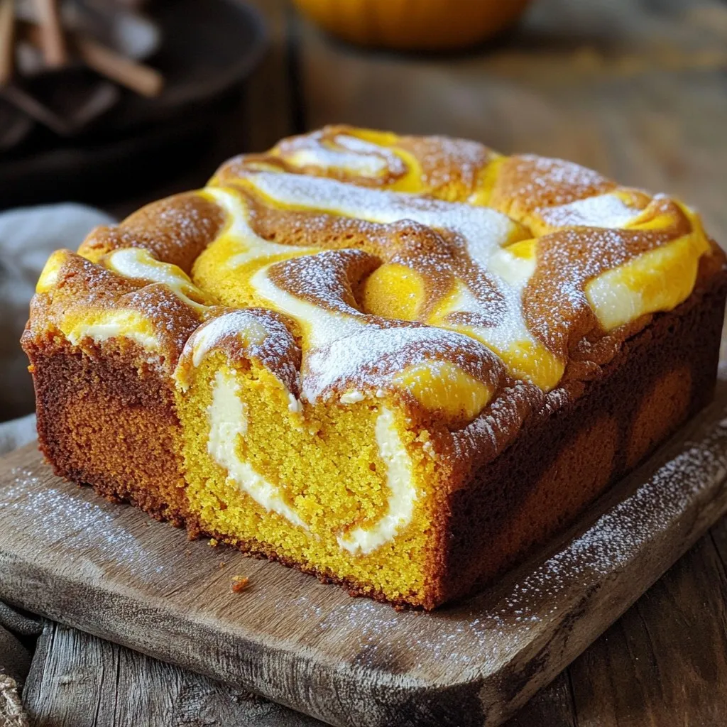 - 1 ½ cups all-purpose flour - ½ teaspoon baking powder - ½ teaspoon baking soda - ½ teaspoon salt - 1 teaspoon ground cinnamon - ½ teaspoon ground nutmeg - ¼ teaspoon ground ginger - ½ cup unsalted butter, softened - 1 cup granulated sugar - ½ cup packed brown sugar - 3 large eggs, at room temperature - 1 cup canned pumpkin puree - 1 teaspoon pure vanilla extract - 8 oz cream cheese, softened - ½ cup powdered sugar - Powdered sugar for dusting - Simple icing (powdered sugar mixed with milk) When I make Pumpkin Cream Cheese Pound Cake, I use simple and fresh ingredients. The dry ingredients are key for a perfect base. The flour, baking powder, baking soda, salt, and spices blend well. The spice mix gives the cake its warm flavor. The wet ingredients are just as important. The butter makes the cake rich and soft. The sugars add sweetness and depth. Eggs help bind everything together. Pumpkin puree adds moisture and flavor. The cream cheese swirl makes it extra special. For garnishes, I love dusting the top with powdered sugar. It adds a nice touch. You can also drizzle a simple icing for a sweet finish. This cake is perfect for any gathering. It looks great and tastes even better! - Preheat oven to 350°F (175°C). - Prepare a 9x5-inch loaf pan. Grease it well and add parchment paper to the bottom. This helps in easy removal later. - In a medium bowl, whisk together the dry ingredients. Mix 1 ½ cups flour, ½ teaspoon baking powder, ½ teaspoon baking soda, ½ teaspoon salt, 1 teaspoon cinnamon, ½ teaspoon nutmeg, and ¼ teaspoon ginger until uniform. Set this aside. - In a large bowl, beat ½ cup softened butter with 1 cup granulated sugar and ½ cup brown sugar. Mix on medium speed until light and fluffy. This takes about 3-4 minutes. - Next, add 3 large eggs one at a time. Mix well after each egg. Then, add 1 cup pumpkin puree and 1 teaspoon vanilla extract. Blend until smooth. - Gradually add the dry mix into the wet mix. Use low speed to combine. Mix just until the batter comes together. Don’t overmix it. This helps keep the cake tender. - In a small bowl, beat 8 oz cream cheese with ½ cup powdered sugar. Mix until smooth and creamy. This will be the delicious swirl in your cake. - Pour half of the batter into your prepared loaf pan. Then, dollop half of the cream cheese mixture on top. Gently swirl it with a knife for a marbled look. - Pour the rest of the batter over this layer. Top with the remaining cream cheese mixture. Swirl again lightly. - Bake the cake in the oven for 55 to 65 minutes. To check if it’s done, insert a toothpick into the center. It should come out clean. If the top browns too fast, cover it loosely with aluminum foil. - Once baked, let the cake cool in the pan for 15 minutes. Then, remove it and place it on a wire rack to cool completely. - Ensure all ingredients are at room temperature. This helps the batter mix evenly and rise well. - Avoid overmixing for a tender cake. Mix just until combined to keep the cake soft. - Dust with powdered sugar before serving. This adds a nice touch and makes it look pretty. - Drizzle with icing for added sweetness. Mix powdered sugar with milk for a quick icing. - Incorrect oven temperature. Always use an oven thermometer to check the heat. - Not using parchment paper for easy removal. This step helps the cake come out cleanly after baking. {{image_4}} You can take this pound cake to new heights with simple tweaks. - Add chocolate chips for extra sweetness: Chocolate and pumpkin create a delicious mix. The chips melt slightly, making each bite a treat. - Include chopped nuts for texture: Walnuts or pecans add a great crunch. They also enhance the cake's flavor with their nutty notes. This cake can fit different diets with a few easy changes. - Gluten-free substitute for all-purpose flour: Swap regular flour for a gluten-free blend. This keeps the texture soft while making it safe for gluten-free eaters. - Use dairy-free cream cheese alternative: For a dairy-free option, try a plant-based cream cheese. This way, everyone can enjoy the cake. You can boost the festive feel of this cake with seasonal flavors. - Introduce dried cranberries or pecans for a festive twist: These add brightness and texture to the cake. They also make it perfect for holiday gatherings. - Top with seasonal spices like cloves or allspice: A sprinkle of these spices can elevate the cake's aroma. They bring out the warm, cozy feel of fall. To keep your Pumpkin Cream Cheese Pound Cake fresh, store it in an airtight container at room temperature. This keeps the cake moist. If you want to enjoy it for a longer time, refrigerate it. The cold helps preserve its taste and texture. For longer storage, wrap your cake tightly in plastic wrap and foil. This keeps out air and prevents freezer burn. When ready to eat, thaw the cake at room temperature. This way, it returns to its soft, delicious form. If you want a warm slice, microwave it for a few seconds. This brings back its comforting, cozy feel. For a crisp texture, reheat it in the oven. Just place the slices on a baking sheet and warm at 350°F for about 10 minutes. Enjoy the warm, spiced flavor that makes this cake a delight! Pumpkin Cream Cheese Pound Cake stays fresh for about 3 days at room temperature. Store it in an airtight container to keep it moist. If you want it to last longer, place it in the fridge. It can last up to a week in the refrigerator. Just remember to wrap it well to avoid drying out. Yes, you can use fresh pumpkin. However, fresh pumpkin needs to be cooked down and pureed first. This takes more time than using canned pumpkin. Canned pumpkin is usually thicker, so your batter might need a little extra flour to balance it out. Make sure to taste and adjust spices to match your flavor preference. If you want a different flavor or texture, try using mascarpone cheese. It has a similar creamy feel but is milder. You can also use Greek yogurt for a tangy twist. Silken tofu is 
