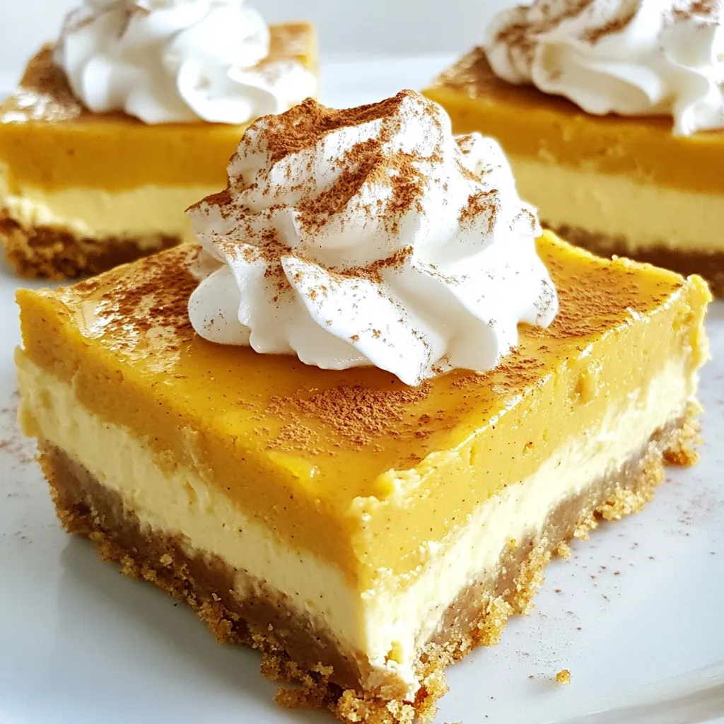 After baking, let the bars cool at room temperature for an hour. This helps set the texture. Then, chill them in the fridge for at least 4 hours. Chilling enhances the flavors. When ready to serve, lift them out using parchment paper. Cut into squares for easy serving. Top each bar with whipped cream and a sprinkle of cinnamon for extra flavor. Enjoy your delightful fall treat!