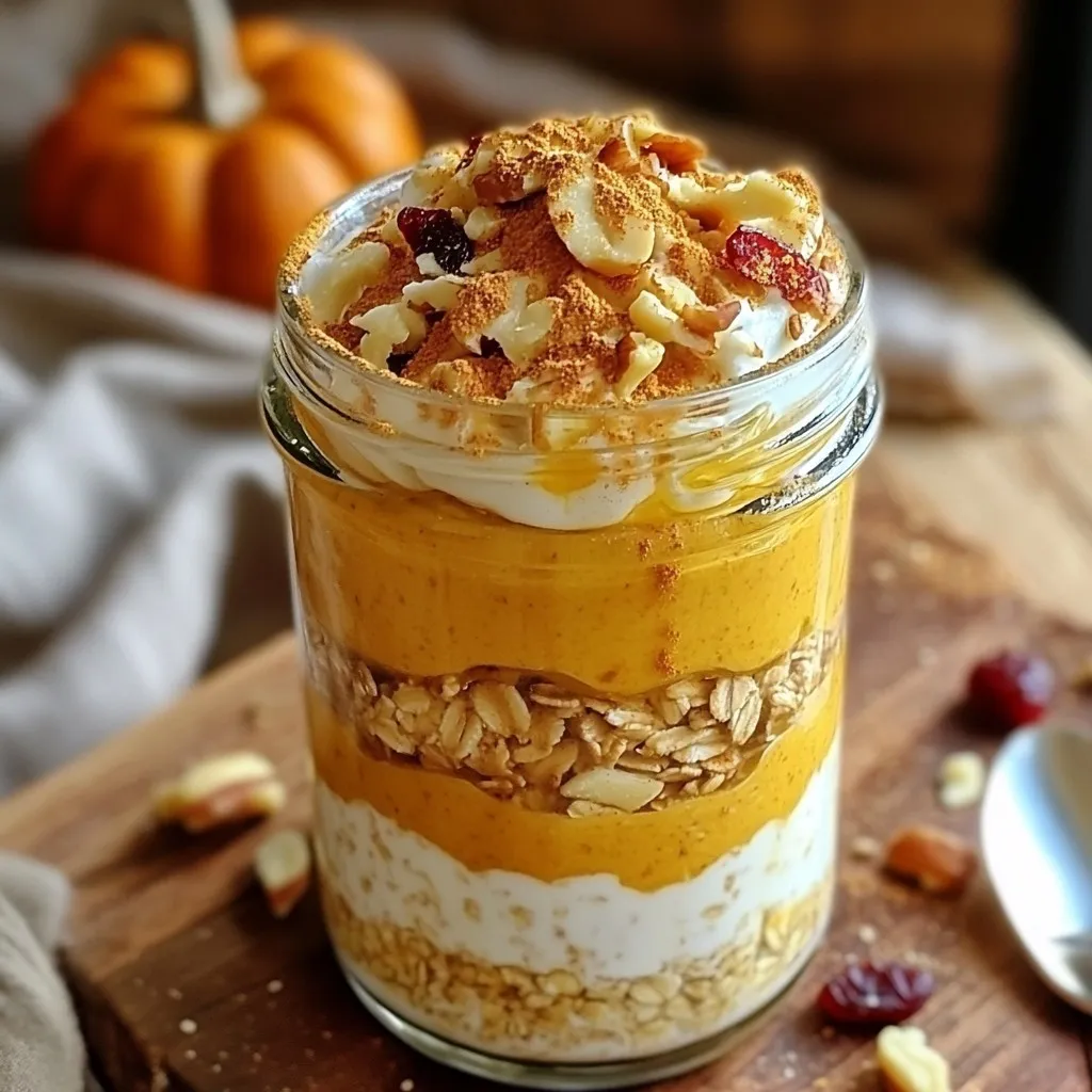 To make pumpkin spice overnight oats, gather these simple ingredients: - 1 cup rolled oats - 1 cup almond milk (or any milk of choice) - 1/2 cup canned pumpkin puree - 1/2 teaspoon pumpkin pie spice - 1 tablespoon maple syrup - 1 tablespoon chia seeds - 1/4 teaspoon vanilla extract - Pinch of salt - Optional toppings: chopped nuts, dried cranberries, or coconut flakes Each ingredient plays a key role in this recipe. The rolled oats form the base, giving you a hearty texture. Almond milk, or your choice of milk, adds creaminess. Canned pumpkin puree brings a rich flavor and a nice orange hue. Pumpkin pie spice gives it that warm fall taste. Maple syrup adds sweetness, while chia seeds add a boost of nutrition. Vanilla extract enhances the flavors, and a pinch of salt balances everything out. Toppings like chopped nuts or dried cranberries add crunch and extra flavor. Coconut flakes give a touch of sweetness and chewiness. You can mix and match these toppings based on what you love. Each ingredient helps create a tasty breakfast that feels like fall in a jar! {{ingredient_image_1}} To start, grab a medium bowl or a large mason jar. In this container, mix together the rolled oats and almond milk. Then, add the canned pumpkin puree. Next, sprinkle in the pumpkin pie spice. This spice gives the oats that warm fall flavor. Now, pour in the maple syrup, and add the chia seeds. These seeds help thicken the oats. Don't forget the vanilla extract and a pinch of salt. Stir everything well until all the oats are soaked. This ensures a tasty blend. Once mixed, seal the bowl or jar tightly. You can use a lid or plastic wrap. Place it in the fridge overnight. If you are short on time, four hours is a good minimum. The oats need this time to absorb the liquid and soften. This soaking makes the oats creamy and delicious. In the morning, take your oats out of the fridge. Stir them again to mix everything up. Taste a spoonful; if you want it sweeter, add a bit more maple syrup. Serve your oats in individual bowls or enjoy right from the jar. For a fun touch, add toppings like chopped nuts, dried cranberries, or coconut flakes. A sprinkle of pumpkin pie spice on top adds extra flavor. For a cute look, serve in clear jars. A cinnamon stick can also give it an autumn feel. To make your pumpkin spice overnight oats burst with flavor, use quality ingredients. Canned pumpkin puree should be pure and smooth. I recommend fresh pumpkin pie spice for the best taste. You can adjust the maple syrup to match your sweet tooth. If you want more spice, add a dash of nutmeg or cinnamon. These small changes make a big difference. Mix well to ensure every bite is tasty. The key to creamy overnight oats is the right balance of liquid and oats. Use one cup of almond milk for every cup of oats. Chia seeds help thicken the mix, so don’t skip them. If your oats seem too thick in the morning, stir in a splash of milk. If they are too runny, add a bit more oats or chia seeds. Finding the perfect texture takes practice, but it’s worth it. Serve your oats in clear jars for a beautiful look. This way, you can see the vibrant layers. A sprinkle of pumpkin pie spice on top adds charm. For a fun touch, place a cinnamon stick in each jar. You can also add chopped nuts or dried cranberries for color and crunch. A pretty presentation makes breakfast feel special, even on busy mornings. Pro Tips Use Steel-Cut Oats for Chewiness: If you prefer a heartier texture, substitute rolled oats with steel-cut oats. Just be sure to increase the soaking time to allow them to soften properly. Experiment with Milk Alternatives: While almond milk is delicious, try using oat milk or coconut milk for a different flavor profile. Each milk brings its unique creaminess to the dish. Make it a Meal Prep Staple: Double or triple the recipe and portion it into individual jars for a quick breakfast option throughout the week. Just add toppings in the morning! Add a Protein Boost: Mix in a scoop of protein powder or Greek yogurt before refrigerating for an extra protein kick that will keep you fuller longer. {{image_2}} You can easily make this recipe dairy-free. Just use almond milk or any plant-based milk you prefer. Oat milk and coconut milk both work well. These milks add creaminess without dairy. You still enjoy that rich, fall flavor. Feel free to swap some ingredients to fit your taste. Instead of maple syrup, try agave syrup or honey for sweetness. If you don’t have pumpkin puree, use mashed banana or applesauce. Both add natural sweetness and moisture. Chia seeds can be replaced with flaxseeds if you prefer. These swaps keep your oats exciting while still tasty. As the seasons change, you can change the flavors too. In winter, add a touch of peppermint extract for a festive twist. In spring, fresh berries can give a bright flavor. In summer, peach or mango puree can be refreshing. This recipe is flexible and fun, so don’t hesitate to get creative! You can store pumpkin spice overnight oats in a sealed jar or bowl. Use a lid to keep the oats fresh. If you plan to enjoy them later, try to keep toppings separate. This will keep the texture nice. You can add nuts or fruits just before eating. These oats stay fresh in the fridge for up to five days. After that, they may lose flavor or texture. If you notice any odd smells or changes, it's best to toss them. Always check before eating. Fresh is best! You can enjoy overnight oats cold, but you can also warm them up. If you want to reheat, put the oats in a microwave-safe bowl. Heat them on medium for about 30 seconds. Stir and check the temperature. If they need more time, heat in 15-second bursts. Add a splash of milk if they seem dry. You can use rolled oats for this recipe. They soak well and create a nice texture. If you want to use instant oats, keep in mind they will absorb more liquid. This may make your oats softer and a bit mushy. I prefer rolled oats for a chewier bite. You can swap almond milk wi