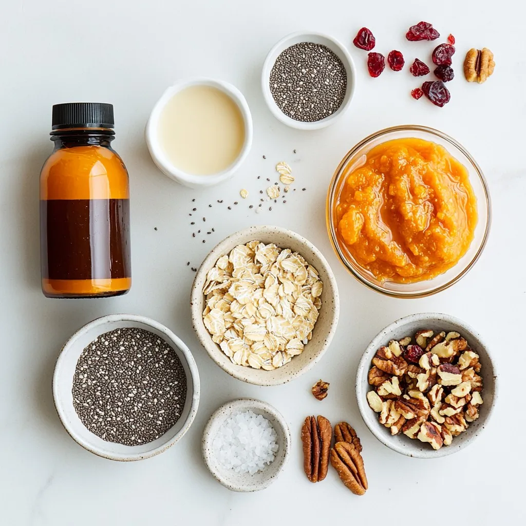 Each ingredient plays a key role in this recipe. The rolled oats form the base, giving you a hearty texture. Almond milk, or your choice of milk, adds creaminess. Canned pumpkin puree brings a rich flavor and a nice orange hue. Pumpkin pie spice gives it that warm fall taste. Maple syrup adds sweetness, while chia seeds add a boost of nutrition. Vanilla extract enhances the flavors, and a pinch of salt balances everything out.