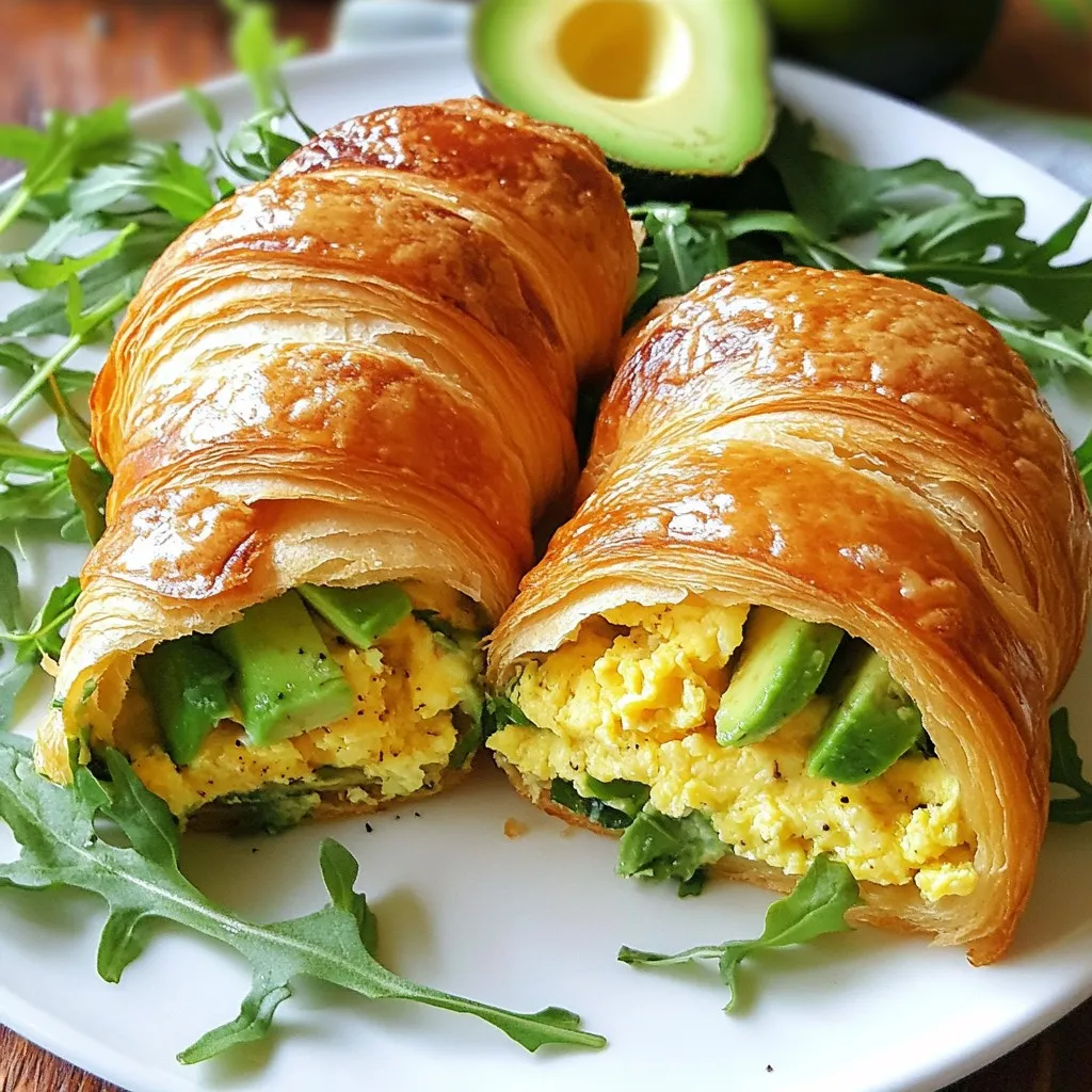 A delicious and hearty breakfast sandwich featuring buttery croissants, cheesy scrambled eggs, and fresh avocado.