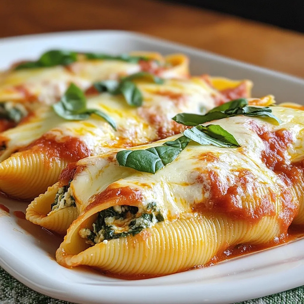 Delicious jumbo pasta shells filled with a creamy ricotta and spinach mixture, topped with marinara sauce and melted cheese.
