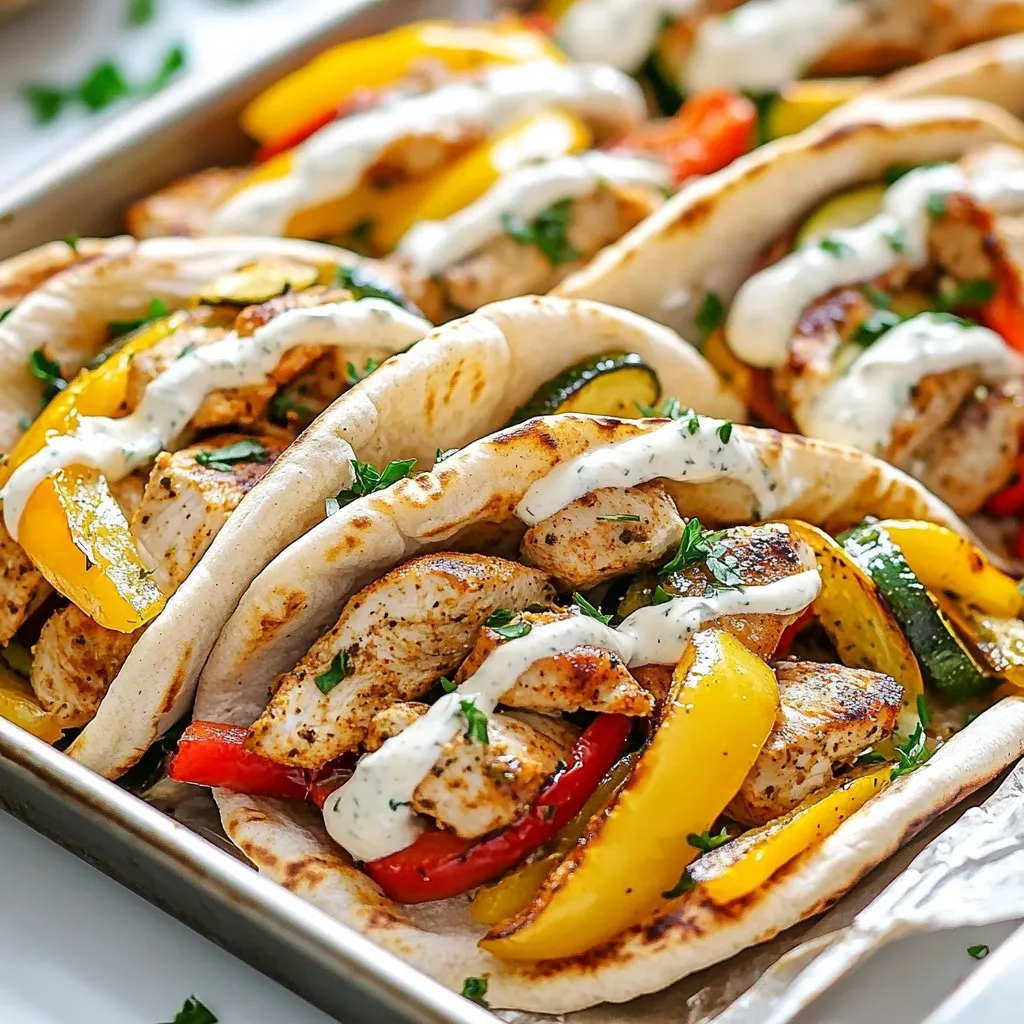 - 2 boneless, skinless chicken breasts, cut into bite-sized pieces - 1 teaspoon garlic powder - 1 teaspoon onion powder - 1 teaspoon paprika - 1 teaspoon dried oregano - ½ teaspoon salt - ¼ teaspoon black pepper - 1 red bell pepper, sliced - 1 yellow bell pepper, sliced - 1 zucchini, sliced - 2 tablespoons olive oil - 4 whole wheat pitas - ½ cup ranch dressing - Fresh parsley, chopped for garnish The main ingredients make this dish shine. First, we use chicken breasts. Their lean protein cooks tender and juicy. Next, bell peppers and zucchini add color and crunch. The whole wheat pitas give a nice, hearty base. For seasoning, I like garlic powder and onion powder for depth. Paprika adds a smoky touch, while dried oregano gives a hint of earthiness. Salt and black pepper enhance all the flavors, making each bite pop. - Fresh herbs, like cilantro or dill - Sliced avocado or cucumber - Additional ranch dressing or other sauces For garnishes, I suggest fresh herbs. Chopped cilantro or dill can brighten the dish. You can add sliced avocado for creaminess. A drizzle of extra ranch dressing can take it up a notch, too! These garnishes make each bite unique. You can mix and match based on what you have. Explore flavors that suit your taste for a fun twist! {{ingredient_image_1}} 1. Preheat your oven to 425°F (220°C). This high heat helps cook the chicken and veggies quickly, keeping them juicy. 2. In a large bowl, add the chicken pieces. Then, sprinkle in the garlic powder, onion powder, paprika, dried oregano, salt, and black pepper. Toss the chicken until all the pieces are well-coated with the spices. This step is key for flavor. 1. Grab a large sheet pan. Arrange the seasoned chicken, sliced red and yellow bell peppers, and zucchini on it. 2. Drizzle the olive oil over everything. Toss gently to coat all ingredients evenly. Spread them out in a single layer. This helps them cook evenly without steaming. 3. Bake in the preheated oven for 20-25 minutes. Check for doneness by ensuring the chicken is no longer pink in the center and the veggies are tender. 1. While the chicken and veggies bake, warm the whole wheat pitas. Use a toaster or skillet, heating them for about 1-2 minutes on each side until soft. 2. Once done, take each pita and cut it in half. Fill each half with a generous portion of the chicken and veggie mix. 3. Drizzle ranch dressing over the top. Finish with a sprinkle of fresh parsley for a touch of color and flavor. Enjoy the tasty combination! To ensure even cooking for both chicken and veggies, spread them out well on the sheet pan. Overcrowding can lead to steaming, which makes them soggy. It’s best to keep a little space between each piece. Use a thermometer to check the chicken’s doneness. It should reach 165°F (75°C) for safe eating. Keep an eye on the veggies, too; they should be tender and slightly charred. Oven temperatures can vary. If your oven runs hot or cool, adjust the cooking time. Start checking the chicken and veggies at the 20-minute mark. If they need more time, add it in small increments. This way, you avoid overcooking. You can boost the flavor of this dish with more spices. Try adding chili powder for some heat or cumin for a warm touch. Fresh herbs like basil or cilantro can also brighten your meal. To make homemade ranch dressing, mix together 1 cup of Greek yogurt, 1 tablespoon of dried dill, 1 teaspoon of garlic powder, and 1 teaspoon of onion powder. Add a squeeze of lemon juice and salt to taste. This simple recipe gives you a fresh, creamy ranch that pairs perfectly with your chicken pitas. Pro Tips Perfectly Seasoned Chicken: Ensure the chicken is evenly coated with the seasoning for maximum flavor. Marinating it for 30 minutes can enhance the taste even more. Veggie Variety: Feel free to mix in other vegetables like cherry tomatoes or asparagus for added color and nutrients. Just be aware of their cooking times! Keep It Crisp: Avoid overcrowding the pan. A single layer allows the chicken and veggies to roast evenly, resulting in a nice crisp texture. Ranch Dressing Alternatives: Try swapping ranch dressing with tzatziki or hummus for a different flavor twist. They add a refreshing touch to the pitas! {{image_2}} You can switch out chicken for turkey if you prefer. Turkey works great and stays juicy. If you want a plant-based option, try tofu. Simply press it to remove excess water, then cut it into bite-sized pieces. This swap keeps the meal light and healthy. For veggies, feel free to mix it up. Broccoli, carrots, or cherry tomatoes can add great flavor and color. You can also try sweet potatoes for a hearty twist. The key is to use what you love! While ranch dressing is a hit, you can explore other options. Greek dressing adds a fresh, zesty touch. Balsamic vinaigrette gives a sweet and tangy flavor. Both work well with the chicken and veggies. If you like heat, consider adding hot sauce or sriracha. Just a drizzle can transform your pitas into a spicy delight. Adjust the amount based on your taste. Enjoy experimenting! To keep your leftover Sheet Pan Chicken Pitas fresh, follow these simple steps. First, let the pitas cool down to room temperature. Place them in an airtight container. This helps to lock in moisture and flavor. Store them in the fridge. They stay good for up to three days. If you want to keep them longer, consider freezing. When it’s time to enjoy your leftovers, reheat them carefully. The best way is to use the oven. Preheat it to 350°F (175°C). Place the pitas on a baking sheet. Cover them with foil to prevent drying out. Heat for about 10-15 minutes. You can also use a microwave. Just warm them for 1-2 minutes. If you freeze your pitas, thaw them overnight in the fridge before reheating. This method keeps the flavors bright and delicious. Can I use frozen chicken for this recipe? Yes, you can use frozen chicken. Just remember to thaw it first. Thawing helps the chicken cook evenly. If you bake it from frozen, 