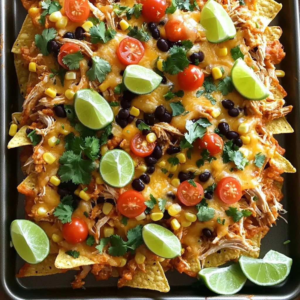 - 2 cups cooked shredded chicken (rotisserie chicken works perfectly) - 1 can black beans, thoroughly drained and rinsed - 1 cup corn kernels (can be fresh, frozen, or canned) - 1 cup cherry tomatoes, halved The main components create a flavorful base for your nachos. Using rotisserie chicken saves time and adds great taste. Black beans add protein and fiber. Corn brings sweetness, while cherry tomatoes add freshness. - 1 cup shredded cheddar cheese - 1 cup shredded Monterey Jack cheese Cheese is key to great nachos. Cheddar gives a sharp bite, while Monterey Jack melts beautifully. Together, they create a creamy texture that binds everything. - 2 tablespoons chipotle peppers in adobo sauce, finely minced - 1/4 cup freshly chopped cilantro - 1 tablespoon freshly squeezed lime juice - 1 teaspoon ground cumin - 1 teaspoon garlic powder - Salt and freshly ground black pepper, to taste The seasoning adds depth to the dish. Chipotle peppers bring heat and smokiness. Lime juice brightens the flavors. Cumin and garlic powder add warmth. Fresh cilantro gives a burst of color and taste, enhancing the overall dish. - Preheat the oven to 400°F (200°C). - In a large bowl, mix cooked shredded chicken, black beans, corn, and halved cherry tomatoes. - Add minced chipotle peppers, lime juice, ground cumin, garlic powder, salt, and pepper. - Stir until everything is well combined. - Take a large baking sheet and layer tortilla chips to cover the bottom. - Spoon the chicken mixture evenly over the chips. Make sure every chip gets some topping. - Sprinkle shredded cheddar and Monterey Jack cheese generously over the top. - Place the baking sheet in the oven and bake for 15-20 minutes. Look for bubbling cheese and golden edges. - Once done, let the nachos cool for about a minute. - Garnish with freshly chopped cilantro before serving. Enjoy with lime wedges for added zest! To make your nachos perfect, ensure you spread the toppings evenly. This way, every bite bursts with flavor. Bake the nachos until the cheese bubbles and turns golden. This step gives you that gooey, melty goodness everyone loves. A colorful platter or baking sheet makes a great serving choice. It adds fun and excitement to your meal. Top your nachos with fresh cilantro and lime wedges. This garnish not only looks good but also adds a pop of flavor. You can swap out the chicken for shredded beef or even tofu for a plant-based option. If you want to change the beans, try pinto or kidney beans. For cheese, experiment with pepper jack or feta for a unique taste. Each of these swaps brings new flavors to your nachos. {{image_4}} You can easily make these nachos meat-free. Start by swapping the chicken for beans. Use a mix of black beans, pinto beans, or even chickpeas. You can also add more veggies for crunch. Bell peppers, zucchini, or even roasted corn work well. Just make sure to season them well with lime juice, cumin, and garlic powder. This way, you keep the flavors bright and fresh while adding extra nutrients. If you love heat, this is your chance! Add more chipotle peppers to the chicken mix. You can also toss in sliced jalapeños for an extra kick. Fresh jalapeños add crunch, while pickled ones give a tangy flavor. Both options will spice up your nachos and make them even more exciting. Just remember, start small if you're unsure how much heat you can handle! Want to try something different? Use pesto to bring a new twist to your nachos. Spread a thin layer of pesto over the tortilla chips before adding the chicken mix. This adds a rich, herby flavor that makes every bite creamy. You can mix the pesto into your cheese blend for an even cheesier experience. It’s a fun way to mix Italian flavors with your favorite nachos! To store your nachos, start by cooling them down. Place any leftover nachos in an airtight container. If you have toppings like cilantro or tomatoes, store them separately. It helps keep the nachos crisp. Try to eat them within two days for the best taste. To reheat nachos, use an oven or toaster oven. Preheat it to 350°F (175°C). Spread the nachos on a baking sheet. Heat them for about 10 minutes. This method keeps the chips crispy and the cheese melty. Avoid using a microwave, as it can make the chips soggy. Freezing nachos is possible, but it changes the texture. If you want to freeze them, assemble the nachos but do not bake them first. Wrap the sheet tightly in plastic wrap. Then, place it in a freezer bag. You can freeze them for up to three months. When ready, bake from frozen at 400°F (200°C) until hot and bubbly. Yes, you can use different cheeses for your nachos. Feel free to mix it up! Some great options include pepper jack for spice or gouda for a smoky flavor. If you want a milder taste, try mozzarella. Just remember to keep the cheese meltable. A blend of cheeses can add depth and creaminess to your dish. Nachos are best enjoyed fresh. However, if you have leftovers, you can store them. Place them in an airtight container. They will stay fresh in the fridge for about two days. The chips may get a bit soggy, but you can still enjoy them. Reheat gently in the oven to bring back some crispness. Nachos pair well with many side dishes. Here are a few ideas: - Guacamole for creaminess and flavor. - Salsa for a fresh and zesty kick. - Sour cream to cool down the heat. - A side salad for a fresh crunch. These sides enhance the nacho experience and make your meal more complete. In this post, we explored nachos, starting with tasty ingredients and flavors. We looked at chicken, black beans, and fun spices. Then, I shared simple steps to prepare, assemble, and bake. Tips for serving and storing made it easy to enjoy leftovers. You can even create variations to suit your taste. Nachos are not just a snack; they are a canvas for creativity. Enjoy making your perfect plate of nachos, and don’t hesitate to try new flavors. Your next gathering will shine with this delicious dish!