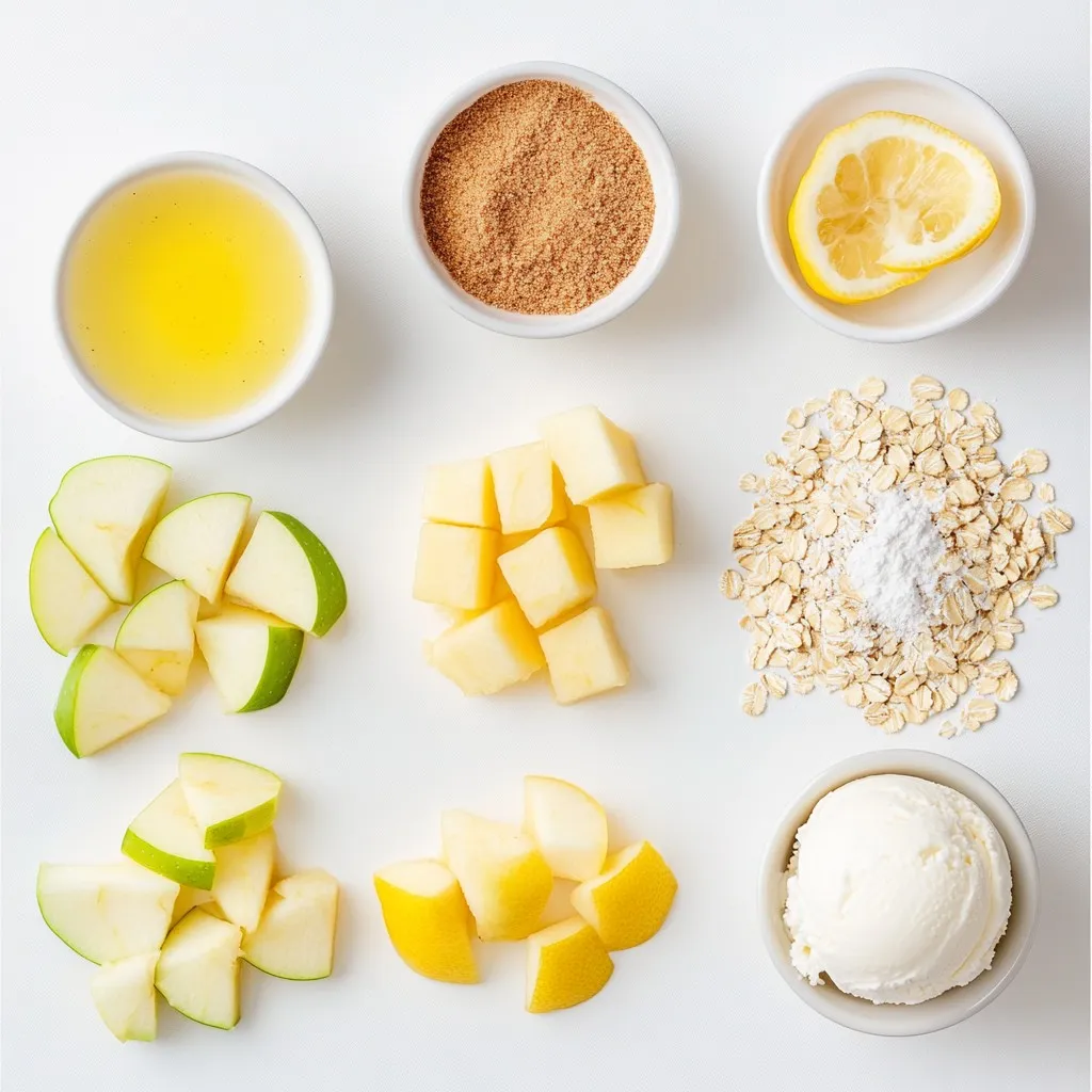 First, gather your ingredients. You need one medium apple, brown sugar, cinnamon, lemon juice, rolled oats, flour, cold butter or coconut oil, and a pinch of salt.