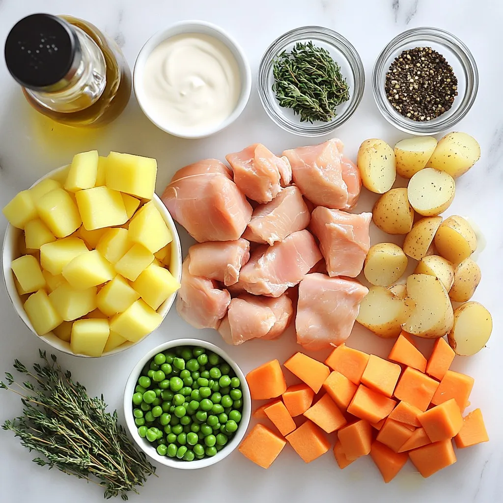 To start, I use 1.5 lbs of boneless, skinless chicken thighs. They cook up tender and juicy, perfect for this dish. Next, I chop 3 medium carrots and 2 medium potatoes. These add sweetness and heartiness.