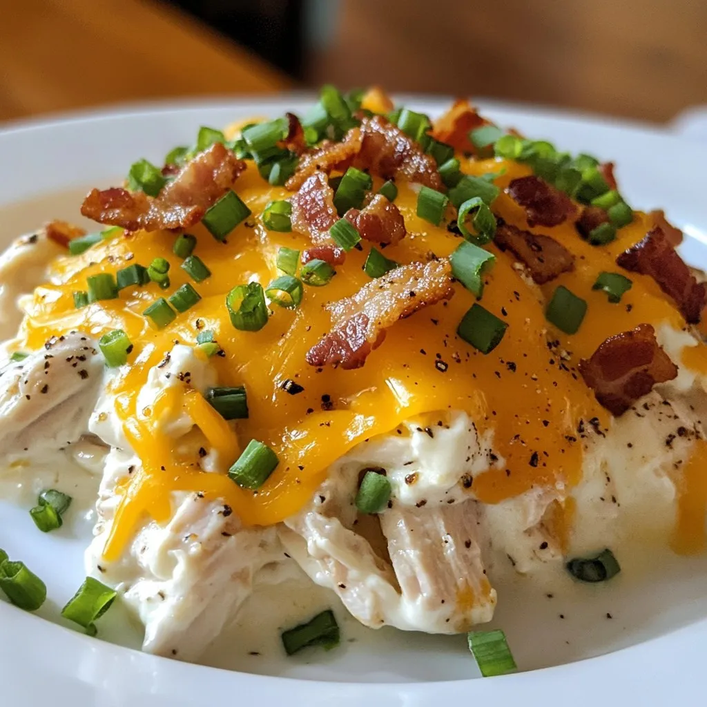 - 2 lbs boneless, skinless chicken breasts - 1 (8 oz) package cream cheese, softened - 1 packet (about 1 oz) ranch seasoning mix - 1 cup low-sodium chicken broth - 1 cup shredded sharp cheddar cheese - 1/2 cup cooked bacon bits - 1/4 cup green onions, finely chopped - Salt to taste - Black pepper to taste These ingredients create a rich, creamy dish. The chicken breasts serve as the base. Cream cheese adds creaminess. Ranch seasoning gives it a tasty kick. Chicken broth keeps the chicken moist while cooking. If you want to boost the flavor, add bacon bits for crunch. Green onions offer a fresh taste and bright color. Season with salt and black pepper to suit your taste. This combination makes the dish shine. You can be creative with garnishes too. Top with extra green onions or cheese for a fun finish. {{ingredient_image_2}} Start with 2 lbs of boneless, skinless chicken breasts. Place them in your slow cooker in a single layer. This helps the chicken cook evenly. Make sure not to crowd the cooker. More space means better heat flow and cooking. Take 1 (8 oz) package of cream cheese and let it soften at room temperature. In a bowl, mix the cream cheese with 1 packet of ranch seasoning. Use a spatula or whisk to blend them until smooth. You want no lumps in the mix. This creamy blend adds rich flavor to the chicken. Once you have the chicken and sauce ready, spread the cream cheese mix over the chicken. Pour 1 cup of low-sodium chicken broth over it. This adds moisture while cooking. Cover the slow cooker and cook it on low for 6-8 hours or on high for 3-4 hours. After cooking, check if the chicken is tender. Use two forks to shred the chicken right in the cooker. Mix it with the creamy sauce until it's well combined. Next, stir in 1 cup of shredded sharp cheddar cheese. This makes your dish even creamier. If you want, fold in 1/2 cup of cooked bacon bits for extra flavor. Finally, taste your creamy ranch chicken. Add salt and black pepper if needed. Before serving, sprinkle with 1/4 cup of finely chopped green onions. This adds a fresh touch and looks great on the plate. Slow cooking is an art. To make the best slow cooker crack chicken, follow these tips: - Layer Your Ingredients: Place chicken breasts at the bottom. This helps them cook evenly. - Use Cream Cheese at Room Temperature: Softened cream cheese blends better with the ranch seasoning. - Don’t Lift the Lid: Opening the lid lets out heat. This can make cooking take longer. - Cook on Low for Best Flavor: Low heat gives the chicken time to absorb all the flavors. You can make this dish your own! Here are some ways to customize your crack chicken: - Add More Cheese: For a cheesier dish, use extra sharp cheddar or mix in mozzarella. - Spice It Up: Add jalapeños or red pepper flakes for a spicy kick. - Herbs and Spices: Mix in garlic powder, onion powder, or fresh herbs for more flavor. - Bacon Options: For a smoky flavor, try using turkey bacon or smoked bacon. Presentation matters! Here are fun ways to serve your crack chicken: - Over Rice: Serve over fluffy white or brown rice for a hearty meal. - On Buns: Make it a sandwich by serving in toasted burger buns. - With Toppings: Add green onions, extra cheese, or even sour cream on top. - On a Bed of Greens: For a lighter option, serve it over a salad. These tips will help you create a delicious, personalized dish that is sure to impress! Pro Tips Use Fresh Ingredients: Opt for fresh green onions and high-quality chicken for the best flavor and texture in your creamy ranch chicken. Adjust the Creaminess: If you prefer a creamier sauce, feel free to add an extra block of cream cheese or a splash of heavy cream before serving. Experiment with Seasoning: Customize your ranch chicken by adding garlic powder, paprika, or your favorite herbs to the cream cheese mixture for an extra flavor boost. Perfect Shredding Technique: For easier shredding, let the chicken rest for a few minutes after cooking before using forks to pull it apart. {{image_4}} To add heat to your slow cooker crack chicken, use spicy ranch seasoning. You can also add diced jalapeños for extra flavor. Another option is to mix in some hot sauce. Try sriracha or buffalo sauce for a spicy kick. This will make your dish stand out and excite your taste buds. If you want a lighter version, swap the cream cheese for Greek yogurt. This keeps it creamy but cuts calories. You can also use low-fat shredded cheese instead of sharp cheddar. For the chicken broth, choose a low-sodium version to keep the dish healthier. Lastly, add more veggies like spinach or bell peppers for added nutrition and color. For a vegetarian twist, replace chicken with chickpeas or cooked lentils. Use vegetable broth instead of chicken broth to keep it plant-based. You can still enjoy the creamy texture by using cream cheese or a plant-based cream alternative. This way, everyone can enjoy a delicious meal, no matter their diet. After making Slow Cooker Crack Chicken, let it cool to room temperature. Then, transfer it to airtight containers. If you want to freeze it, use freezer-safe bags. Remove as much air as possible before sealing. This helps prevent freezer burn. Label each container with the date for easy tracking. To reheat, you can use the microwave or stovetop. For the microwave, place the chicken in a safe dish. Heat it in short bursts, stirring in between. For the stovetop, warm it in a pan over low heat. Add a splash of chicken broth to keep it moist. Stir well until it’s heated through. In the fridge, Slow Cooker Crack Chicken lasts for about 3 to 4 days. If you freeze it, it can last up to 3 months. Always check for any off smells or changes in texture before eating leftovers. This ensures your meal stays safe and tasty. Yes, you can use frozen chicken breasts. Just know that it will take longer to cook. Set your slow cooker on high for about 4-6 hours if you start with frozen chicken. Make sure the chicken reaches 165°F for safety. To mak