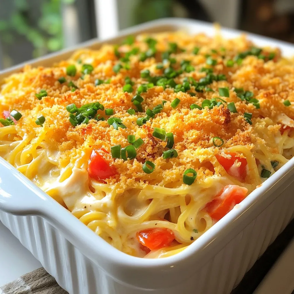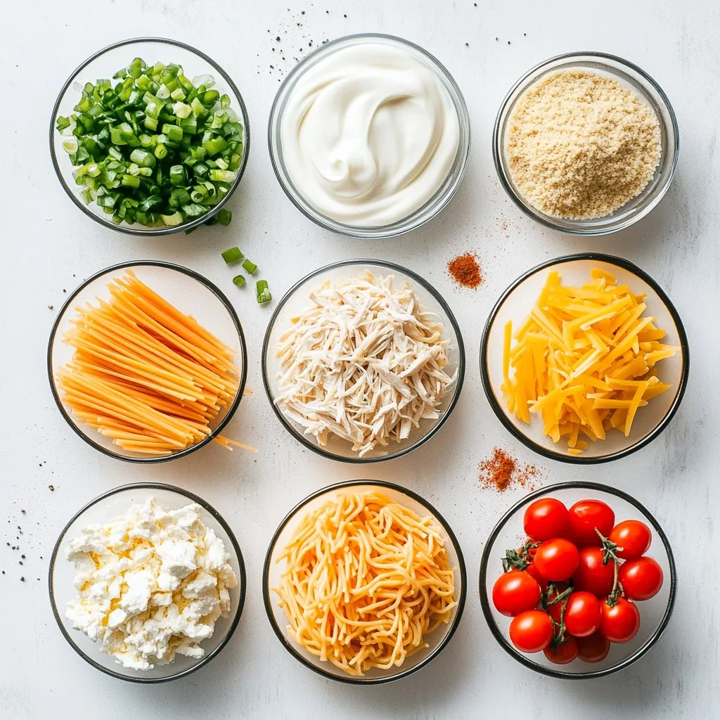 Each ingredient plays a big role. The spaghetti gives a fun base. The chicken adds protein. Cream cheese and sour cream bring richness. Cheddar and mozzarella add a cheesy pull. Diced tomatoes add freshness. Green onions give a nice crunch. Seasonings like garlic powder and paprika add depth. Finally, breadcrumbs create a crispy topping.