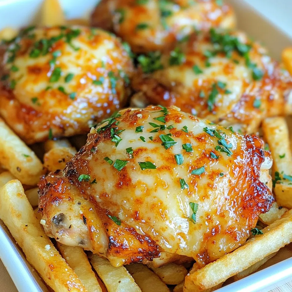 A flavorful dish featuring chicken thighs seasoned with garlic and spices, served alongside crispy fries.