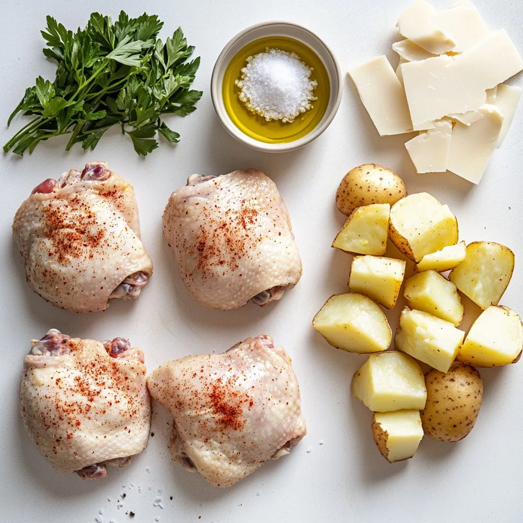 For this dish, I choose bone-in and skin-on chicken thighs. They stay juicy and tender while baking. The skin also adds crunch and flavor. You need just 1/4 cup of olive oil. This oil helps the spices stick to the chicken and gives it a nice golden color.