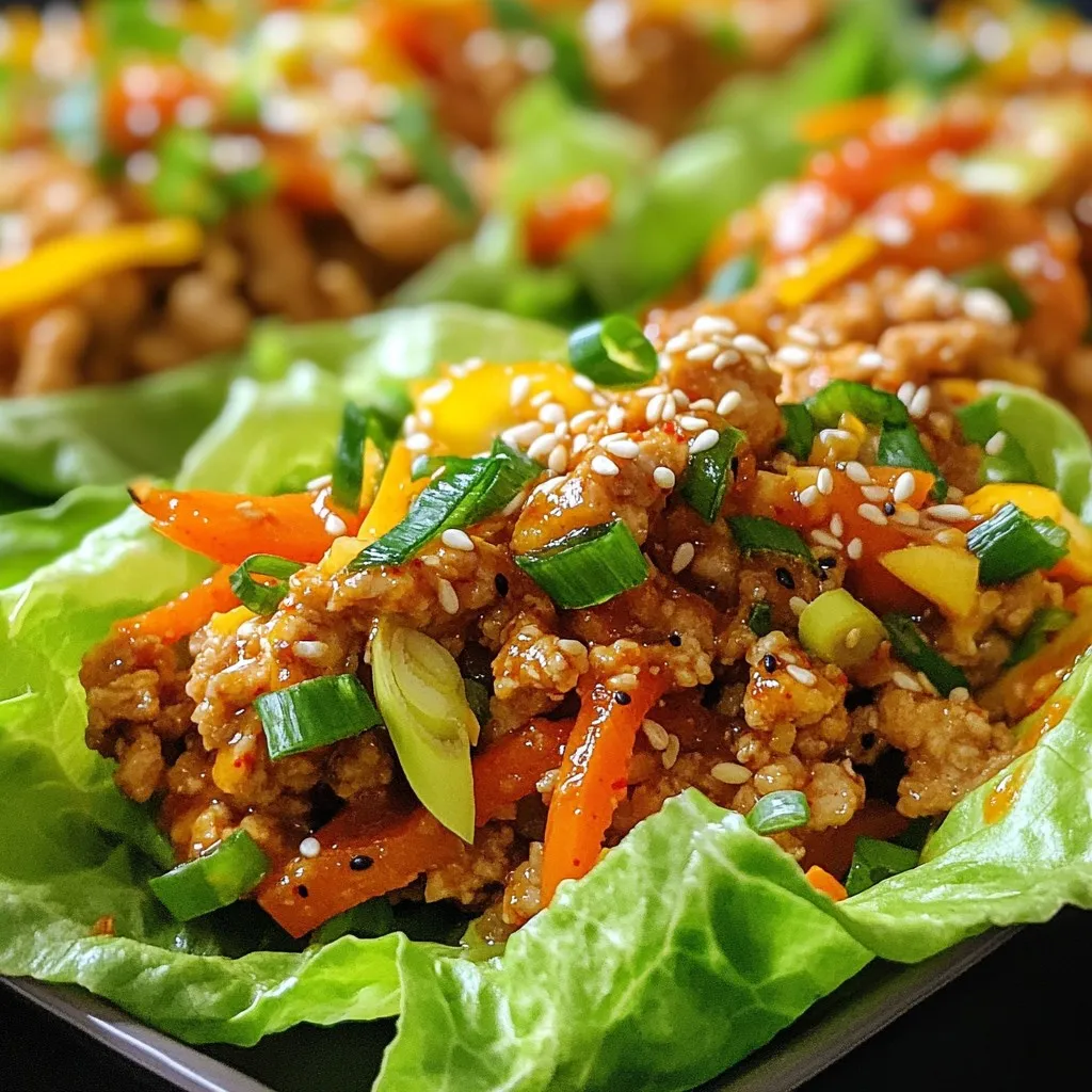 To make spicy gochujang chicken lettuce wraps, gather these main items: - 1 lb ground chicken - 2 tablespoons gochujang (Korean chili paste) - 1 tablespoon soy sauce - 1 tablespoon sesame oil - 2 cloves garlic, minced - 1 inch fresh ginger, grated - 1 red bell pepper, finely diced - 1 cup shredded carrots - 4 green onions, chopped - 1 tablespoon rice vinegar - 1 tablespoon honey or maple syrup - Salt and pepper to taste - 12 large butter or romaine lettuce leaves For extra flavor and appeal, use these garnishes: - Sesame seeds - Extra chopped green onions If you don’t have certain items, here are some swaps: - Ground turkey can replace ground chicken. - Sriracha can work in place of gochujang. - Olive oil can substitute for sesame oil. - Any crisp lettuce can replace butter or romaine leaves. {{ingredient_image_1}} Gather all your ingredients first. This makes cooking easier and faster. You need: - 1 lb ground chicken - 2 tablespoons gochujang (Korean chili paste) - 1 tablespoon soy sauce - 1 tablespoon sesame oil - 2 cloves garlic, minced - 1 inch fresh ginger, grated - 1 red bell pepper, finely diced - 1 cup shredded carrots - 4 green onions, chopped - 1 tablespoon rice vinegar - 1 tablespoon honey or maple syrup - Salt and pepper to taste - 12 large butter or romaine lettuce leaves - Sesame seeds for garnish Make sure your veggies are washed and chopped. This helps with cooking time. Heat a large skillet over medium heat. Add the sesame oil to the pan. When the oil is hot, add the minced garlic and grated ginger. Sauté for one minute. This will make your kitchen smell great. Next, add the ground chicken. Use a spatula to break it apart. Cook the chicken for about 5 to 7 minutes. You want it browned and fully cooked. Stir in the gochujang, soy sauce, rice vinegar, and honey (or maple syrup). Mix it well to coat the chicken. This sauce gives your dish its spicy kick. Add the diced red bell pepper and shredded carrots. Cook for an additional 2 to 3 minutes. You want the peppers to soften just a bit. Season the mix with salt and pepper. Just before removing from the heat, stir in the chopped green onions. Now comes the fun part: assembling your wraps! Take a large lettuce leaf. Spoon a generous amount of the spicy chicken mix onto it. Sprinkle sesame seeds on top for garnish. If you like it spicier, add a drizzle of gochujang on top. Enjoy your colorful and tasty wraps as a light meal or a fun snack! To enjoy these wraps, you need to balance the spice. Gochujang adds heat, but you can adjust it. If you want less spice, use less gochujang. Mix in a bit of honey for extra sweetness. You can also add more veggies like carrots to cool it down. You can prep a lot of this dish in advance. Cook the chicken mixture and store it in the fridge. It stays good for up to three days. When you’re ready to eat, just warm it up. Assemble the wraps fresh for the best taste. These wraps work great as appetizers or light meals. Serve them with extra gochujang on the side for spice lovers. You can also add some lime wedges for a zesty kick. For a fun twist, serve with rice or quinoa on the side. Enjoy the bright colors and flavors! Pro Tips Fresh Ingredients: Always use fresh vegetables and herbs for the best flavor. Fresh carrots and bell peppers will add crunch and vibrant color to your wraps. Adjust the Spice: If you prefer less heat, start with 1 tablespoon of gochujang and taste before adding more. You can always increase the spice level according to your preference. Make Ahead: Prepare the chicken mixture ahead of time and store it in the refrigerator. Just reheat it when you're ready to assemble your wraps for a quick meal. Creative Wrapping: Experiment with different types of lettuce or even cabbage leaves for your wraps. Each type will give a unique texture and flavor to your dish. {{image_2}} Want to switch up your protein? You can use ground turkey or beef instead of chicken. Both options bring their own unique flavors. Ground pork adds richness and pairs well with gochujang, too. If you prefer, diced tofu works great for a tasty, protein-packed bite. For a plant-based meal, use lentils or chickpeas. They soak up all the gochujang flavor. You can also try using mushrooms for a meaty texture. Keep the same spices and sauces to keep it bold and satisfying. Serve these in lettuce wraps for a fun, healthy meal. Want to boost the flavor? Add a splash of lime juice for a zesty kick. You can mix in some chopped cilantro for fresh herbs. Try adding a few peanuts or cashews for crunch. If you love heat, toss in sliced jalapeños. Each addition makes the dish even more exciting! You can store leftover spicy gochujang chicken in the fridge. Place it in an airtight container. It stays fresh for up to three days. Make sure it cools down before sealing. This helps keep the chicken juicy and tasty. To freeze, use a freezer-safe bag or container. Remove as much air as you can. The chicken will be good for about two months. When you’re ready to eat, thaw it in the fridge overnight before reheating. For reheating, use a skillet over medium heat. Add a splash of water or broth to keep it moist. Stir until heated through. You can also microwave it. Place the chicken in a bowl, cover it, and heat in short bursts. Check often to avoid overcooking. Enjoy your spicy gochujang chicken warm and flavorful! Gochujang is a spicy Korean chili paste. It has a thick texture and a deep red color. This paste blends chili powder, glutinous rice, fermented soybeans, and salt. Its flavor is sweet, spicy, and umami-rich. I love using gochujang in marinades and sauces. It adds a unique kick to many dishes. You can find gochujang in most Asian grocery stores. It also works well in dips and soups. Yes, you can use many vegetables in these wraps. Try adding sliced cucumbers, shredded cabbage, or bean sprouts. Each vegetable brings its own flavor and crunch. You can also mix in mushrooms for an earthy taste. Be creative with what you
