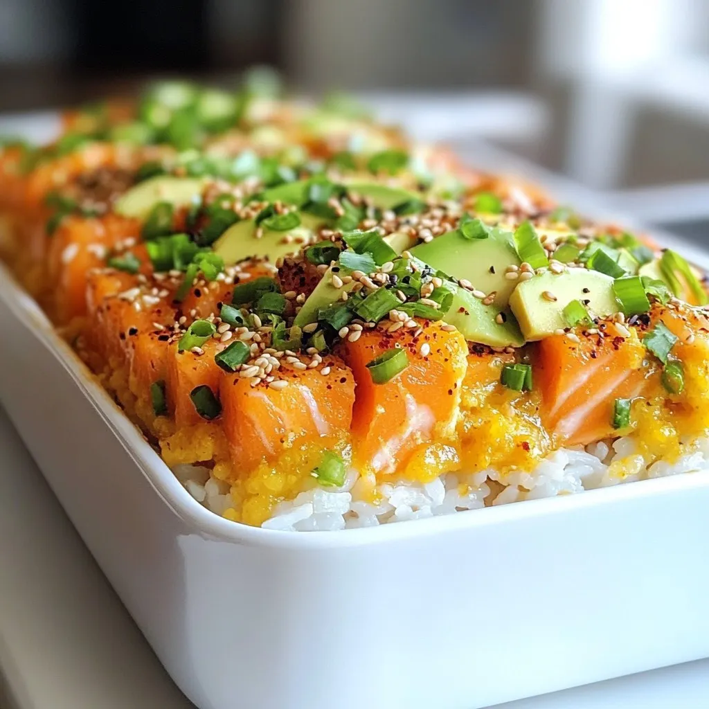 A delicious and easy-to-make sushi bake featuring spicy salmon, perfect for sharing.