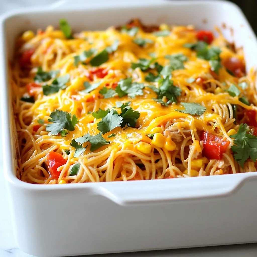 Once it’s done, let the casserole cool for a few minutes. This helps the flavors settle. You can serve it hot right from the baking dish. For a nice touch, garnish with chopped fresh cilantro. This adds color and freshness. Pair your casserole with a side salad or garlic bread for a full meal. Enjoy your Spicy Southern Chicken Spaghetti Casserole!