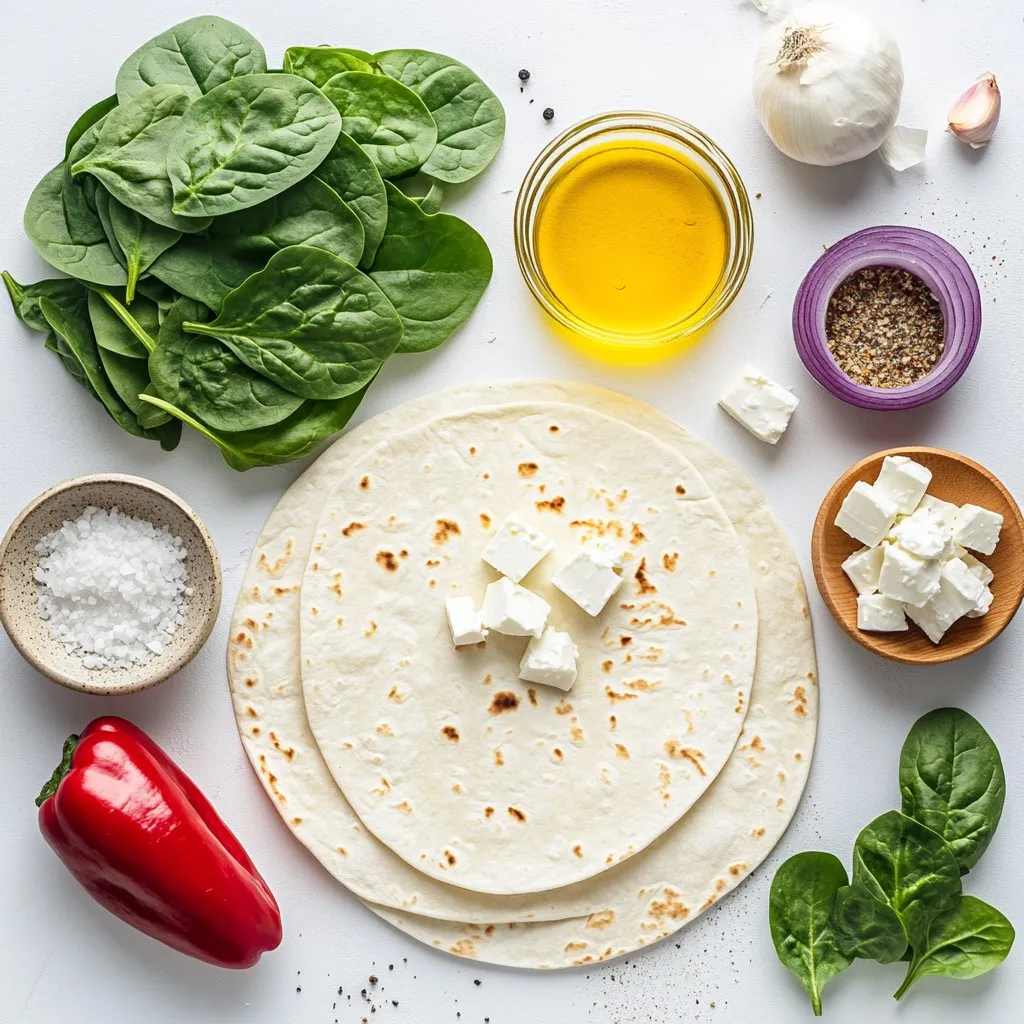 To make the best spinach feta quesadillas, gather these ingredients. Each one brings flavor and joy to your plate. Fresh spinach adds a nice crunch. Feta cheese gives a rich, tangy taste. Mozzarella melts perfectly, making every bite smooth.