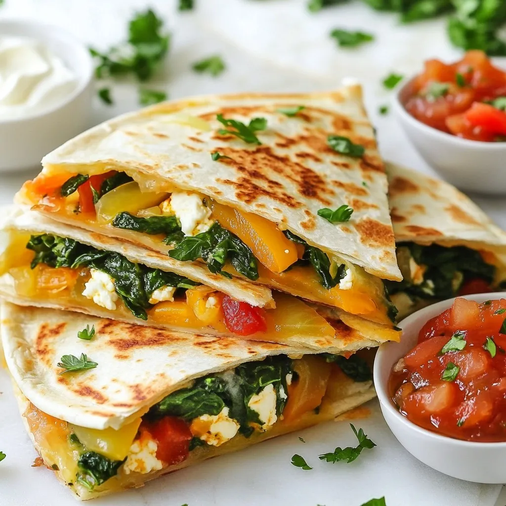 - 2 cups fresh spinach, chopped - 1 cup feta cheese, crumbled - 1 cup shredded mozzarella cheese - 1 medium onion, thinly sliced - 1 red bell pepper, diced - 1 tablespoon olive oil - 1 teaspoon garlic powder - 1 teaspoon ground cumin - 4 large flour tortillas - Salt and pepper to taste - Fresh parsley, chopped (for garnish) - Salsa and sour cream (for serving) To make the best spinach feta quesadillas, gather these ingredients. Each one brings flavor and joy to your plate. Fresh spinach adds a nice crunch. Feta cheese gives a rich, tangy taste. Mozzarella melts perfectly, making every bite smooth. You can add other ingredients to make it your own. Consider adding: - Shredded chicken for protein - Black beans for extra fiber - Jalapeños for some heat - Avocado for creaminess These options can enhance the taste and make your quesadillas even better. Feel free to mix and match based on your mood! Each serving offers a balanced meal. Here’s what you get per serving: - Calories: Approximately 300 - Protein: 15g - Carbohydrates: 30g - Fat: 15g - Fiber: 3g This meal is not only tasty but also fuels your day. It’s a great way to enjoy veggies and cheese all in one bite! {{ingredient_image_1}} To start making your quesadillas, heat olive oil in a large skillet over medium heat. Add the thinly sliced onion and diced red bell pepper. Cook them until soft and clear, which takes about 5 to 7 minutes. Next, toss in the chopped spinach and stir until it wilts, about 2 to 3 minutes. Then, add garlic powder, ground cumin, salt, and pepper. Mix well and remove from heat. Let this mixture cool for a moment. In a mixing bowl, combine the cooled veggies with crumbled feta and shredded mozzarella. Stir until everything is well mixed. Wipe the skillet clean to remove any bits. Place it back on medium heat. Lay one flour tortilla in the skillet. Spread a generous amount of your spinach and cheese mixture over half of the tortilla. Fold the tortilla in half, covering the filling. Cook for about 3 to 4 minutes on each side. You want it to turn golden brown and for the cheese to melt. Repeat this process for the remaining tortillas and filling. Once cooked, cut each quesadilla into wedges. For serving, place the quesadilla wedges on a colorful plate. I like to add a side of salsa and a dollop of sour cream for dipping. A sprinkle of chopped fresh parsley adds a nice touch. Enjoy your tasty Spinach Feta Quesadillas! To make perfect quesadillas, start with a hot skillet. Use medium heat to warm your pan. Add just enough olive oil to coat the bottom. This prevents sticking and helps the quesadilla crisp nicely. Place your filled tortilla in the skillet. Cook for 3-4 minutes on each side. Look for a golden brown color and melted cheese. One common mistake is overfilling the quesadilla. Too much filling makes it hard to flip. Another error is cooking on too high heat. This can burn the tortilla before the cheese melts. Lastly, do not skip letting the filling cool slightly. Hot filling can tear the tortilla and create a mess. To boost flavor, add spices like chili powder or smoked paprika. Fresh herbs like cilantro or basil can also enhance taste. Consider adding cooked chicken or black beans for extra protein. For a twist, use different cheeses, like pepper jack for some heat. Enjoy your quesadillas with fresh salsa and sour cream for a delicious dip! Pro Tips Use Fresh Spinach: Fresh spinach will provide a vibrant flavor and texture compared to frozen spinach. Always wash and dry it thoroughly before use. Experiment with Cheese: While feta and mozzarella are delicious, you can also try adding a bit of cheddar or pepper jack for a spicy kick! Get Creative with Fillings: Feel free to add other vegetables like mushrooms or zucchini to enhance the nutritional value and taste of your quesadillas. Perfectly Crisp Tortillas: To achieve a perfectly crisp tortilla, ensure your skillet is adequately preheated and avoid overcrowding it with too many quesadillas at once. {{image_2}} If you want to keep it vegetarian, you have great options. You can add mushrooms for a nice earthy taste. Try zucchini or corn for a sweet crunch. These veggies blend well with spinach and feta. You can also swap out the mozzarella for a vegan cheese. This keeps the meal tasty and plant-based. You can mix in other ingredients for more flavor. Try adding olives for a salty kick. Sun-dried tomatoes add a burst of sweetness. You could also use different herbs like thyme or basil. These additions give your quesadillas a unique twist. Experiment with what you like best! If you enjoy a bit of heat, spice it up! Add jalapeños or chili flakes to the filling. You can also use pepper jack cheese for a creamy, spicy flavor. Another option is to serve with hot salsa or a spicy sour cream. This will elevate your quesadillas and excite your taste buds. To keep your spinach feta quesadillas fresh, place them in an airtight container. You can store them in the fridge for up to three days. If you have a lot of leftovers, consider wrapping each quesadilla in plastic wrap. This helps keep them safe from air and moisture. When you’re ready to enjoy leftovers, heat them up on the stovetop. Place a quesadilla in a skillet over low heat. Cook each side for about three minutes until warm and crisp. You can also use a microwave. Just place the quesadilla on a plate and cover it with a damp paper towel. Heat it for about one minute, but watch it closely. If you want to save some quesadillas for later, freezing works well. First, let the quesadillas cool completely. Then, wrap each one in plastic wrap and place them in a freezer bag. They can last for up to three months in the freezer. When you're ready to eat, thaw them in the fridge before reheating. This will help keep the texture nice when you cook them again. Yes, you can use frozen spinach. It is a great option when fresh spinach is not available. Just remember to thaw and drain it well. This step helps remove exc